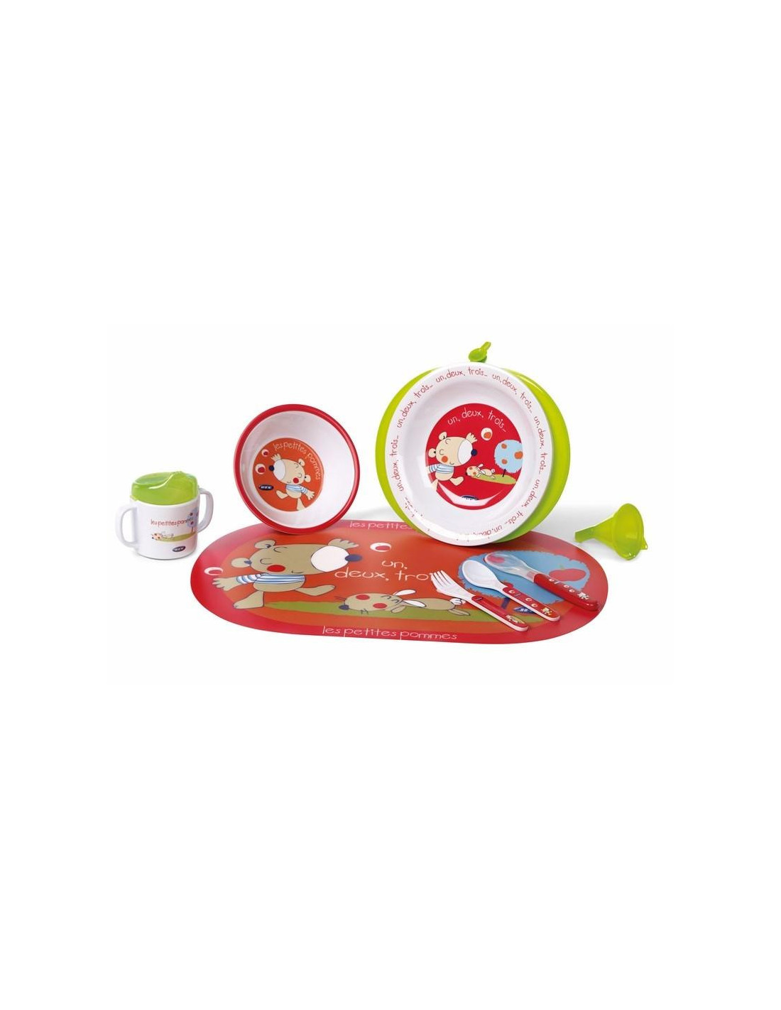 El set incluye: 1 salvamanteles, 1 bol, 1 plato termo, 1 cuchara, 1 tenedor, 1 cuchillo, una taza + tapa con boquilla de quita y pon para que el niño aprenda a pasar del biberón al vaso