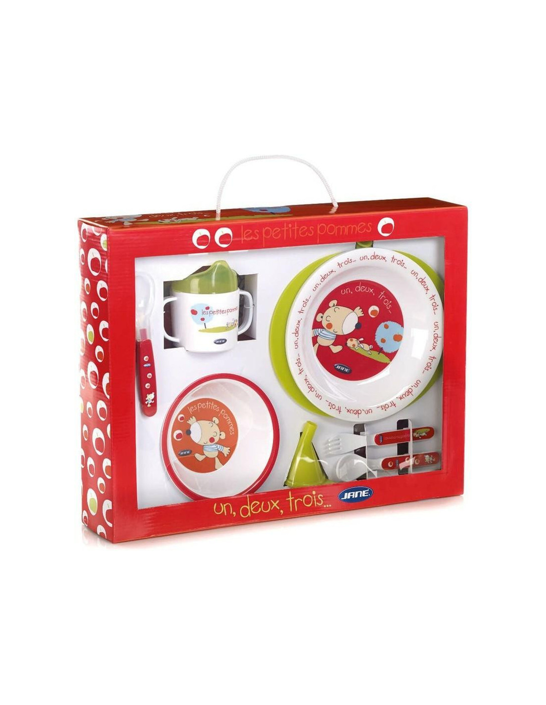 Vajilla Bebe Jane Pommes para bebés de 4 meses en adelante. ¡Preciosa vajilla para tu bebé o para regalagar! Vajilla Bebe Jane Pommes con 9 accesorios.