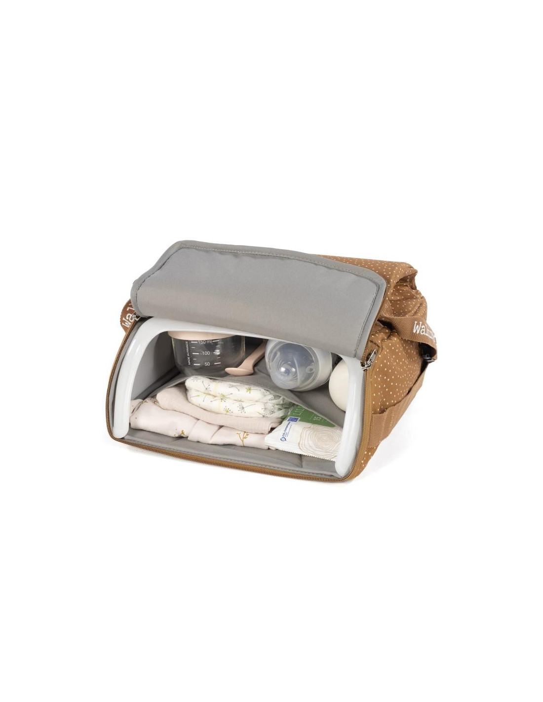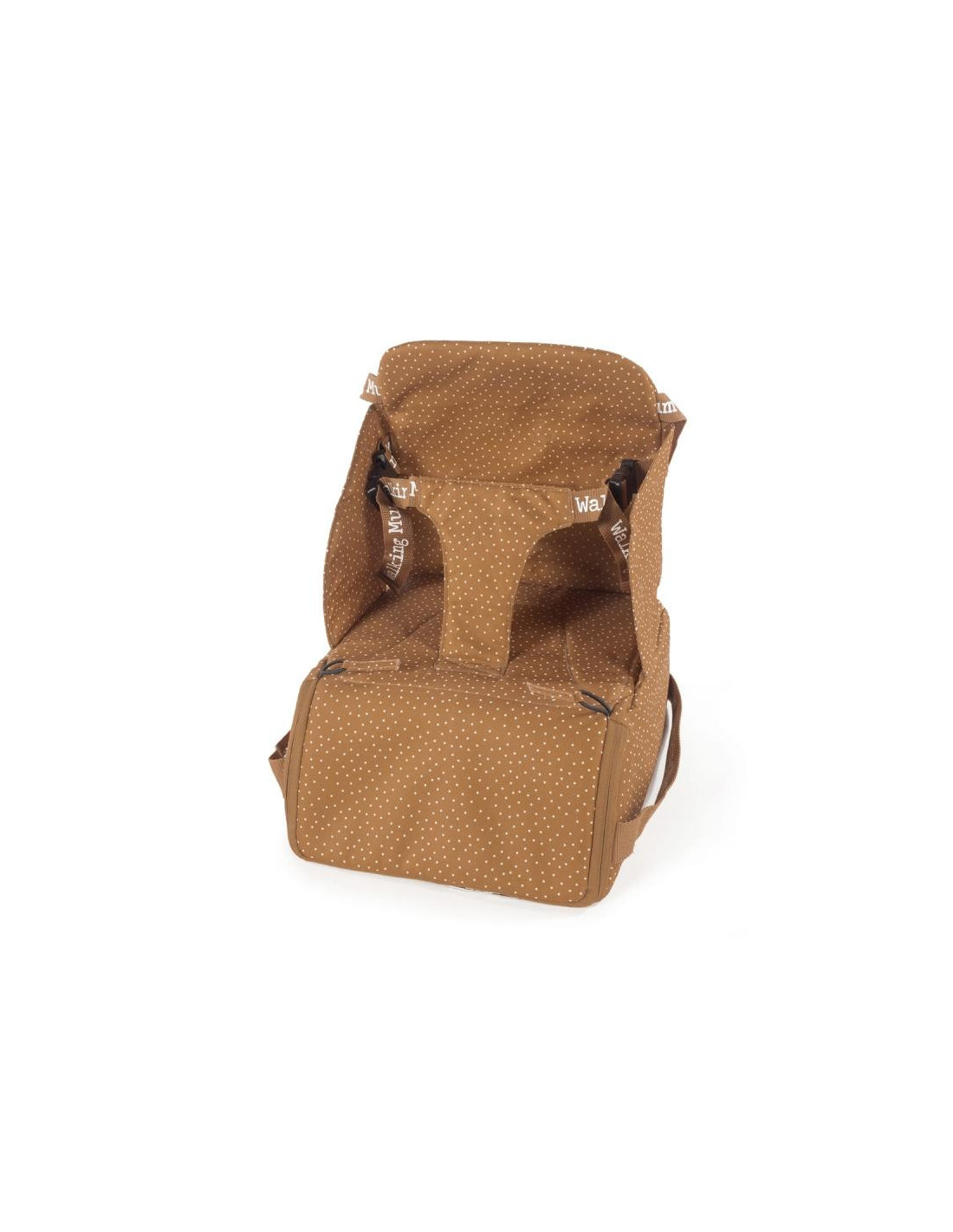 Esta trona portátil para bebés Poppy Musgo con topitos verde es la solución perfecta para padres en movimiento que desean ofrecer a sus pequeños un asiento seguro y cómodo en cualquier lugar. Con un diseño moderno de cuadros en tonos neutros, esta trona que combina funcionalidad y estilo es la solución perfecta para alimentar a tu bebé en cualquier lugar. Su diseño plegable permite llevarla fácilmente a cualquier lugar, ya sea a un restaurante, de viaje o a la casa de los abuelos. Cuenta con una correa para llevarla cómodamente al hombro. Incluye un compartimento de almacenamiento en la base, perfecto para guardar pañales, toallitas u otros accesorios esenciales del bebé. Se adapta a la mayoría de las sillas de adulto estándar, ofreciendo versatilidad y comodidad en diferentes entornos. Incluye correas ajustables para fijarla de manera rápida y segura a al respaldo y al asiento. Las medidas mínimas de las sillas de adulto para poder fijar la trona son: altura mínima de respaldo 48.5 cm, anchura mínima del asiento 36 cm y profundidad mínima del asiento 34 cm. Dispone de arnés ajustables para sujetar bien al bebé proporcionando máxima seguridad durante las comidas. Fabricada con materiales de alta calidad, duraderos y resistentes, ideal para el uso diario. Es muy fácil de limpiar ya que es completamente desenfundable. Esta silla portátil está destinada para bebes que puedan mantenerse sentados por si solos. Desde los 6 meses hasta máximo 3 años o un peso máximo de 15 kgs. Cumple con la normativa EN 16120:2012+A2:2016. Asiento elevador. Walking Mum protege a tu bebé utilizando los mejores tejidos, libres de colorantes azoicos y sustancias nocivas para la salud. Especificaciones: Materiales: 100% Poliéster. Medidas cerrada: 29x36x31 cm.