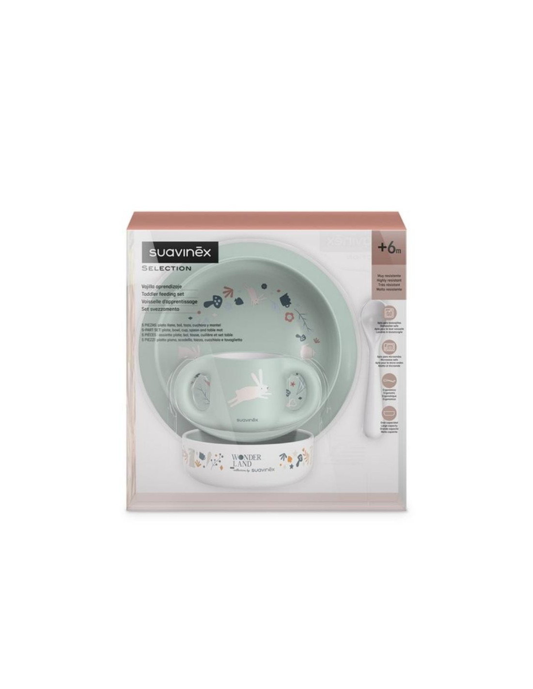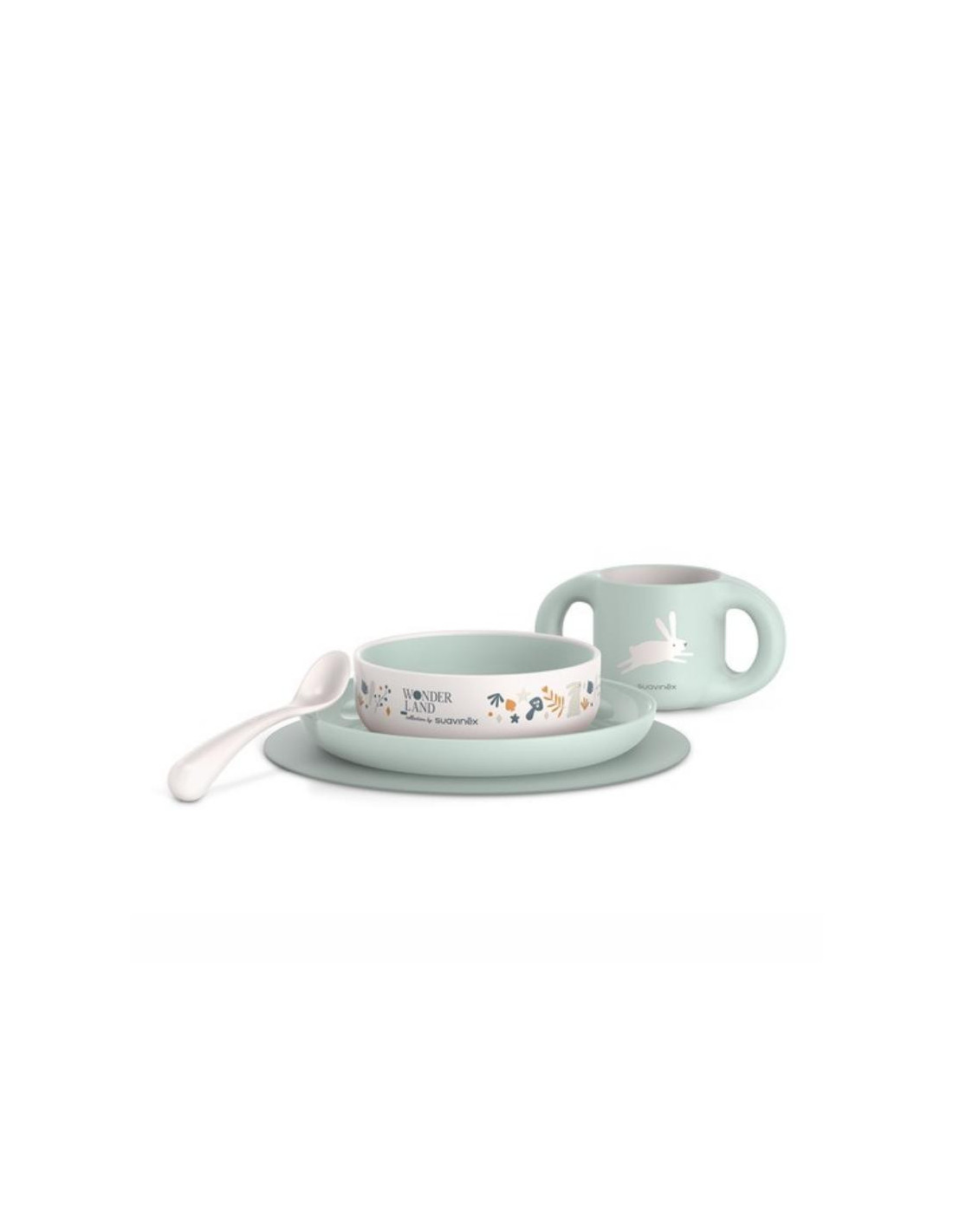 Vajilla compuesta por plato llano y bol de gran capacidad, taza con grandes asitas que facilitan su agarre, cuchara ergonómica ideal para papillas y potitos, y mantel antideslizante que evita que el plato se mueva.