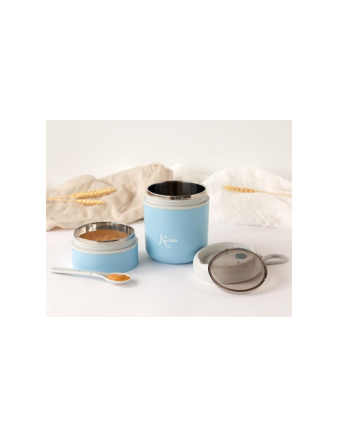 Incluye una práctica cuchara guardada en la tapa superior, que lo hace más completo y cómodo para las salidas familiares.