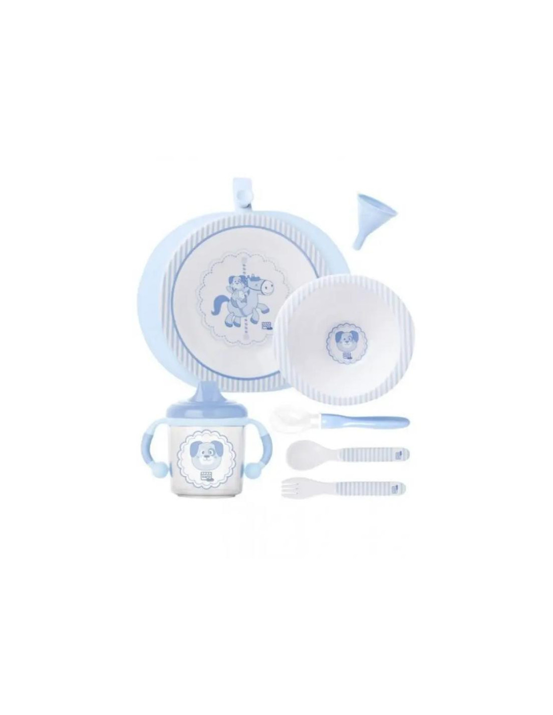 sta práctica vajilla de 6 piezas de la marca Saro Classic esta compuesta por: 1 plato termo, 1 cuenco, 1 vaso de aprendizaje, 1 cuchara, 1 tenedor, 1 cuchara de silicona. Es ideal para utilizarla a partir del 6º mes que es cuando el bebé comienza a comer papillas. Presentado en caja de cartón con ventana. Modelo Sweet wolly 3 colores azul, rosa y gris.
