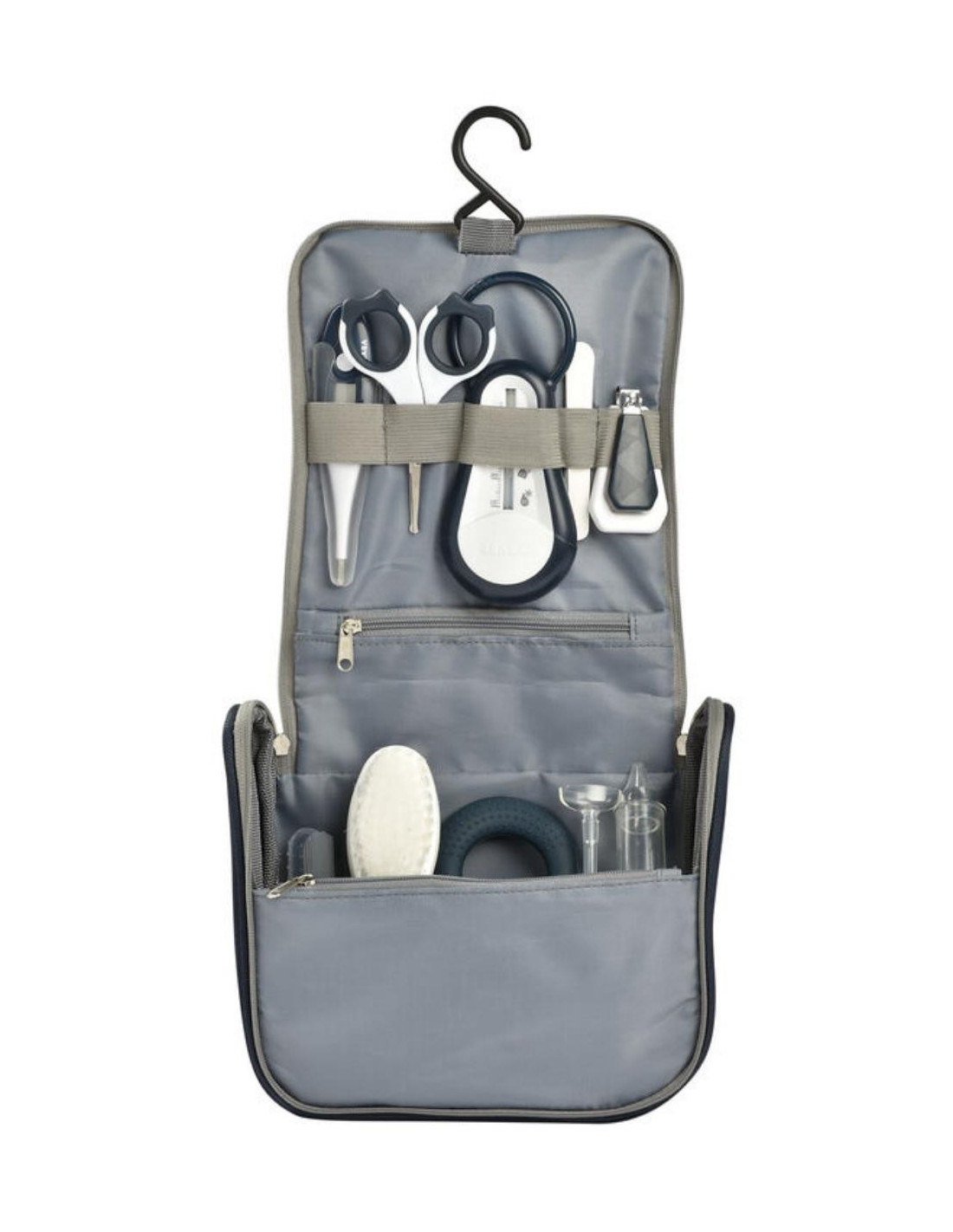 Nueve accesorios indispensables para el aseo y cuidados del bebé : temómetro de baño, termómetro digital, tijeras, corta-uñas, cepillo para el pelo, mordedor, aliviador encias, aspirador nasal manual, lima de uñas