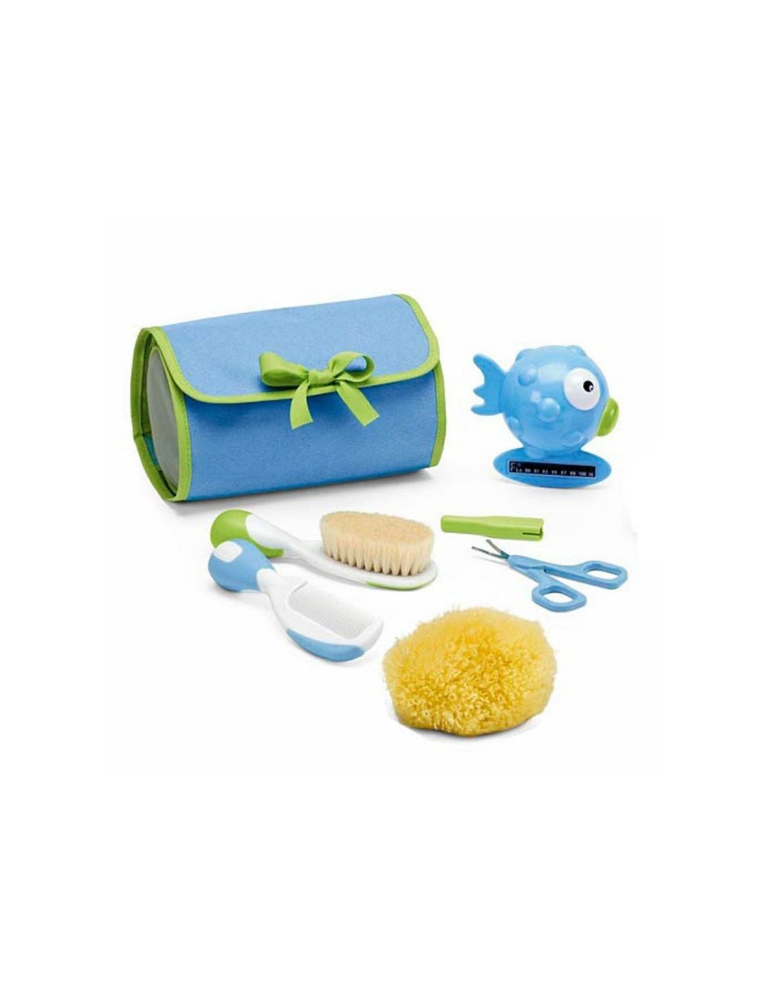 Precioso neceser de higiene con 5 accesorios que incluye: cepillo, peine, tijeras, esponja y termómetro de agua. Dispone de varios compartimentos para guardar y encontrar con facilidad todo lo que el bebé necesita para el baño. Con bolsa impermeable para guardar los objetos mojados. Perfecto para usarlo en casa o de viaje. Puede colgar en la pared. Con tres bolsillos interiores que permite tener a mano los productos indispensables para el bebé.