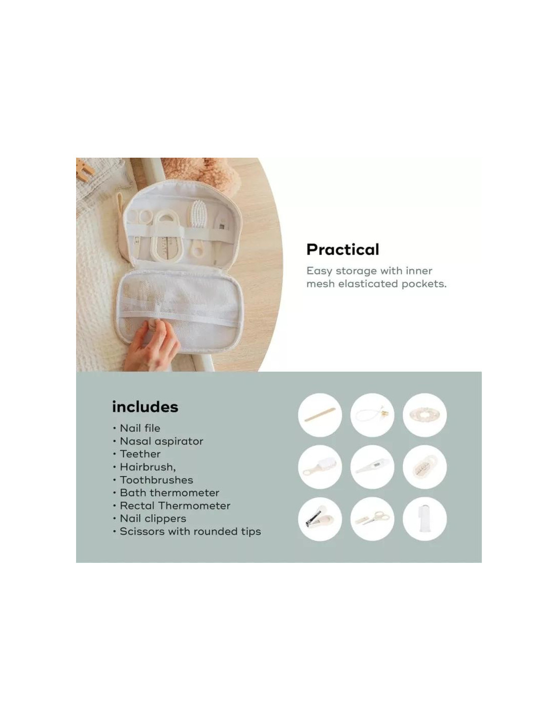 Consta de: Lima de uñas, aspirador nasal, mordedor, cepillo para el cabello, cepillo de dientes, termómetro de baño, termómetro digital, cortaúñas y tijeras con puntas redondeada.