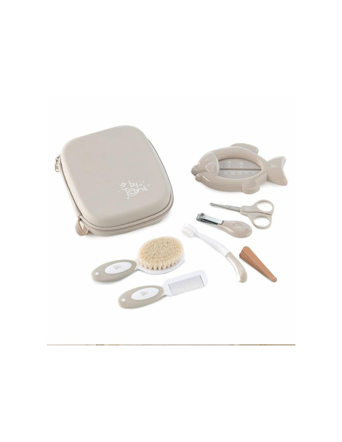 Estuche que incluye 1 cepillo de cerda natural, 1 peine, 1 cepillo de diente, 1 tijeras de seguridad, 1 cortauñas, 4 limas de uñas y 1 termómetro para medir la temperatura del agua. El set más completo para la higiene de tu bebé