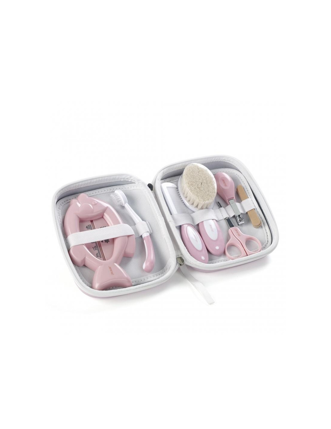 Estuche que incluye 1 cepillo de cerda natural, 1 peine, 1 cepillo de diente, 1 tijeras de seguridad, 1 cortauñas, 4 limas de uñas y 1 termómetro para medir la temperatura del agua. El set más completo para la higiene de tu bebé
