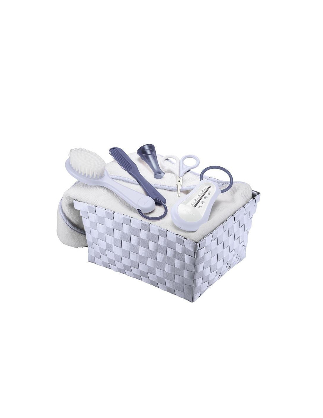 Cesta para el cuidado personal que incluye un termómetro, tijeras, peine, cepillo y una toalla de algodón.