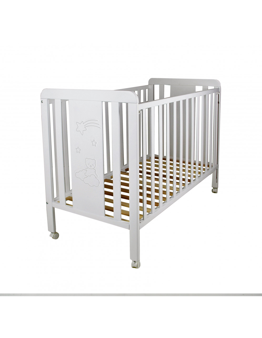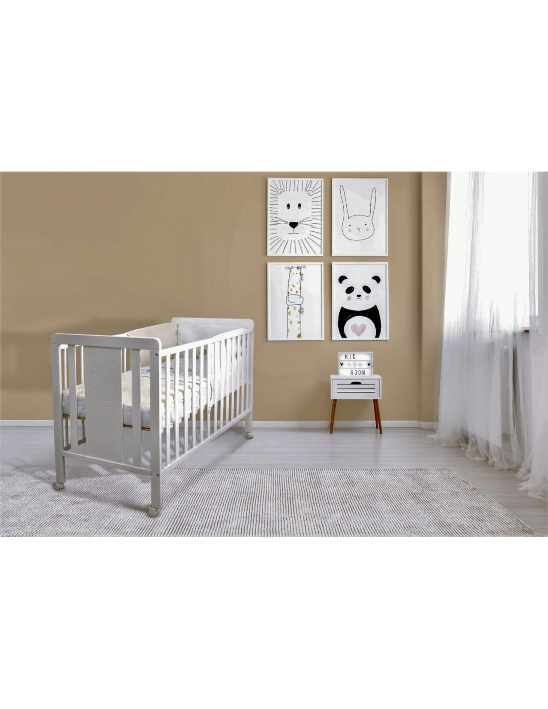 Disponible en blanco y en una combinación de colores blanco y natural, la cuna «Osito» se integra perfectamente en cualquier decoración, aportando calidez y estilo. Con medidas de 60×120 cm, es la elección ideal para quienes buscan una solución compacta y funcional sin renunciar a la belleza y la seguridad.