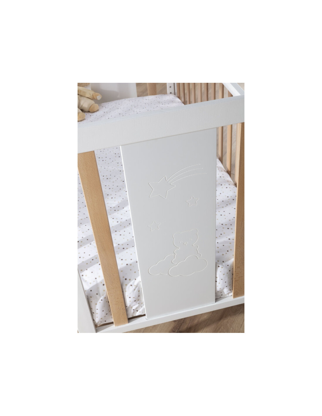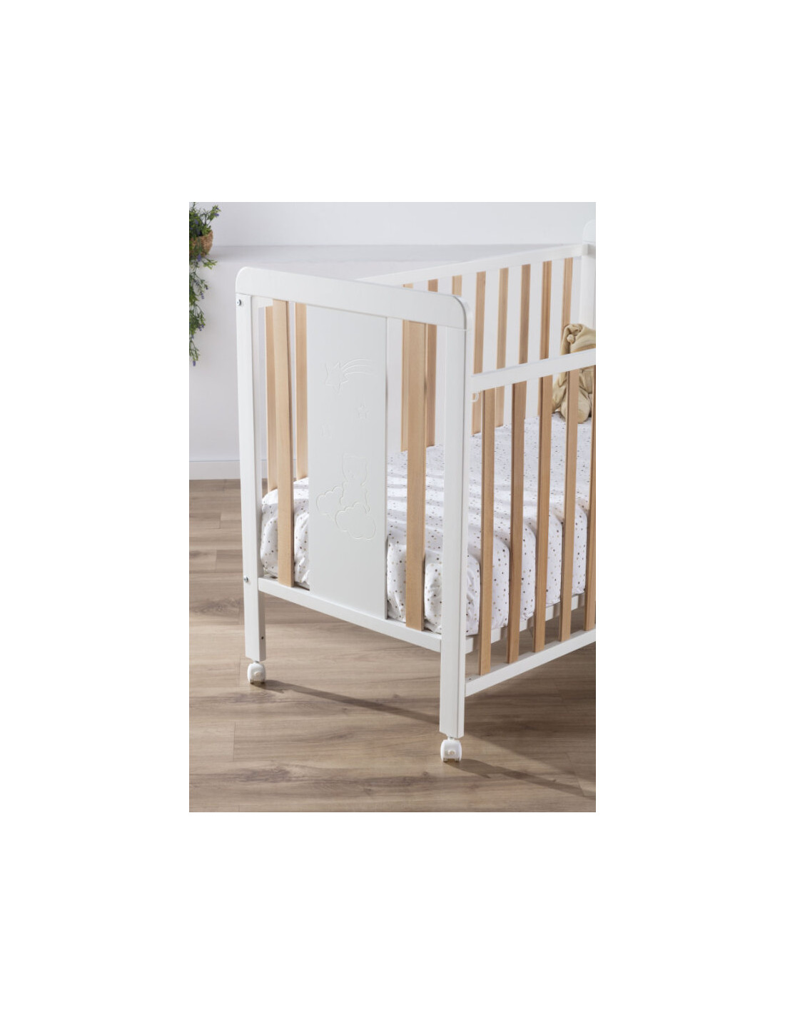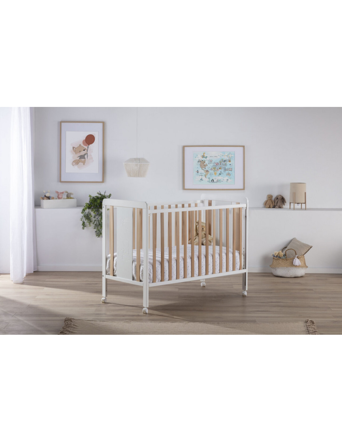 Disponible en blanco y en una combinación de colores blanco y natural, la cuna «Osito» se integra perfectamente en cualquier decoración, aportando calidez y estilo. Con medidas de 60×120 cm, es la elección ideal para quienes buscan una solución compacta y funcional sin renunciar a la belleza y la seguridad.
