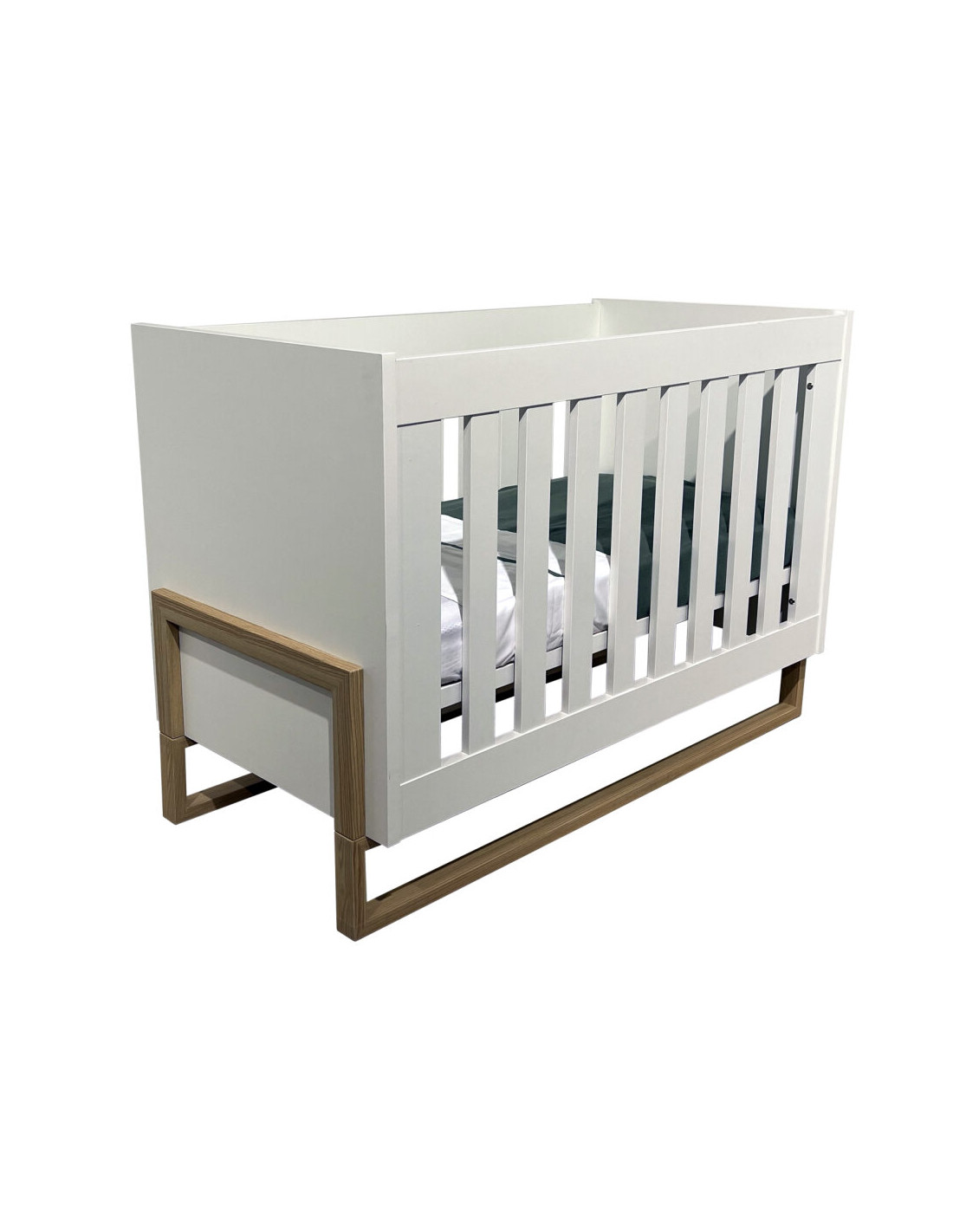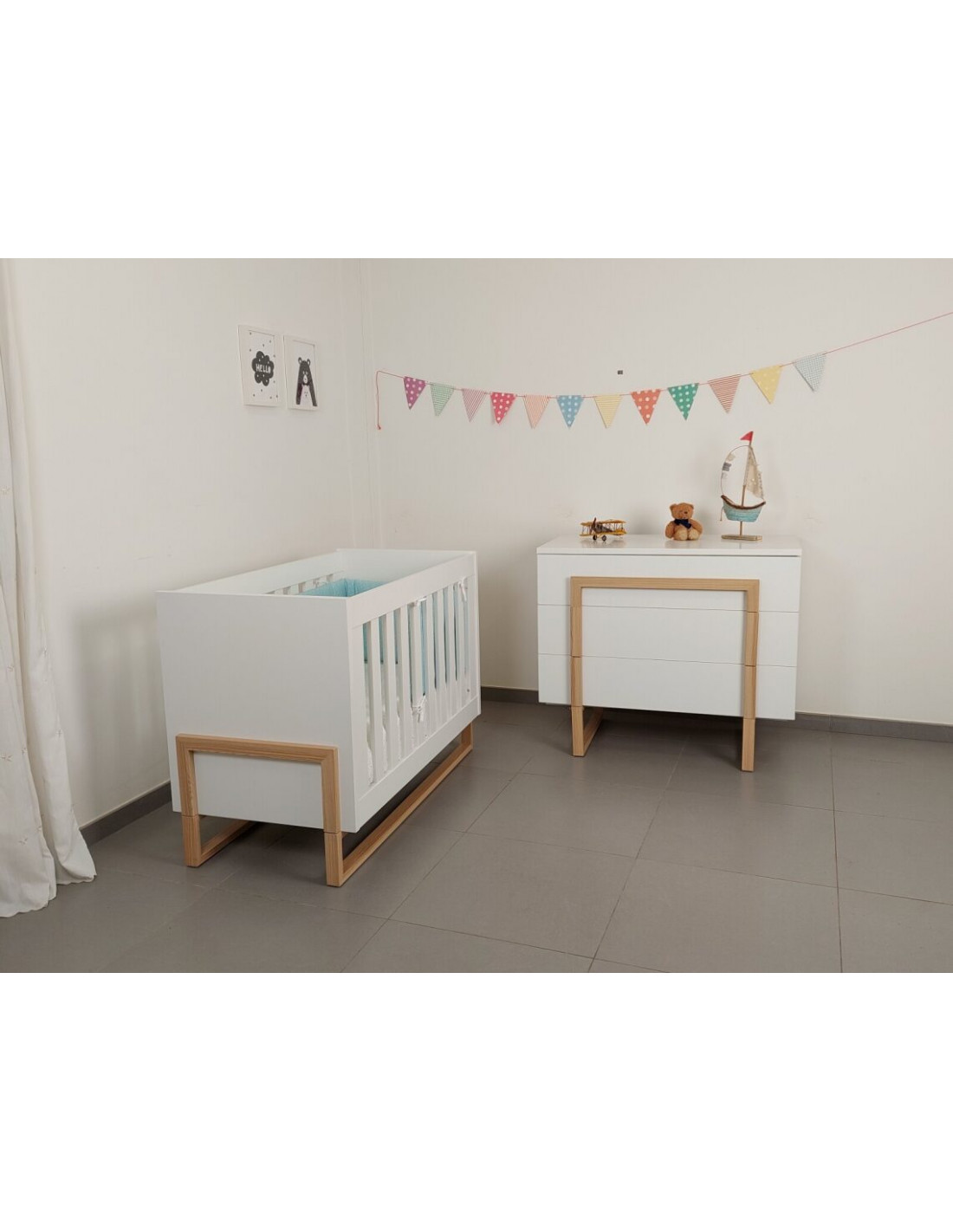 Estilo nórdico contemporáneo: La cuna «Tivoli» destaca por su diseño minimalista con líneas limpias y un contraste atractivo entre el blanco de su estructura y las patas longitudinales en color natural. Este detalle añade calidez y un toque de elegancia a la cuna, integrándose perfectamente en cualquier ambiente infantil moderno.
