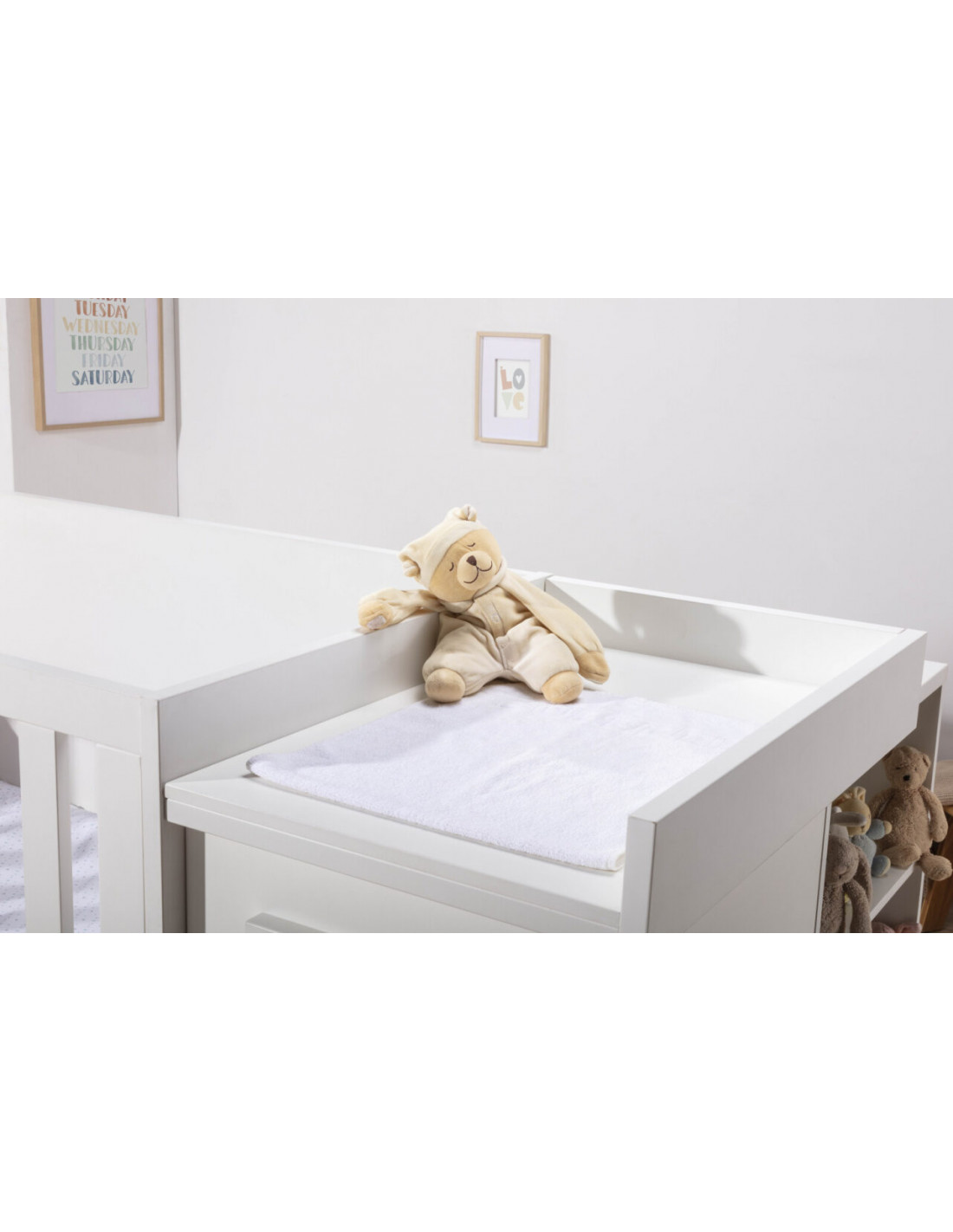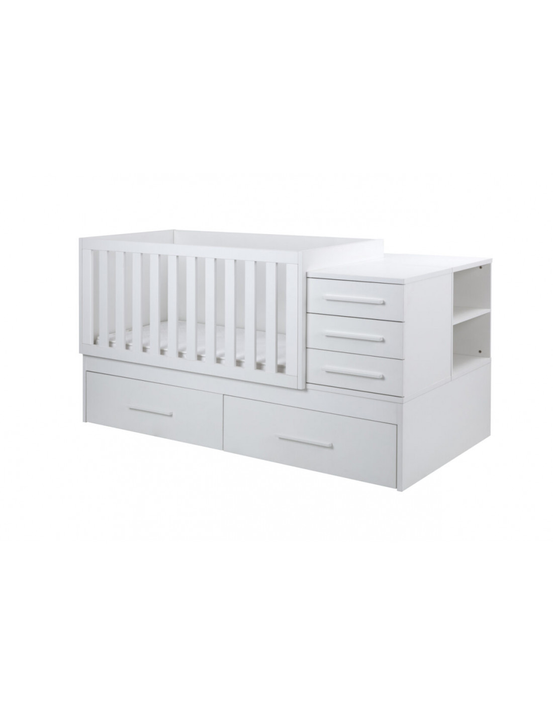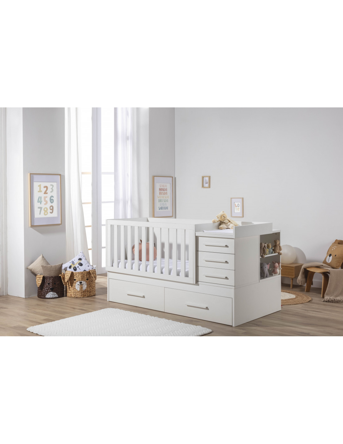 Cuna convertible en una cama: Cuna convertible en una cama. Incluye una cuna (70×140) que posteriormente se convierte en cama (90×190), una mesita cajonera, una mesita estantería, una estantería XL, una mesa escritorio XL y un cambiador.