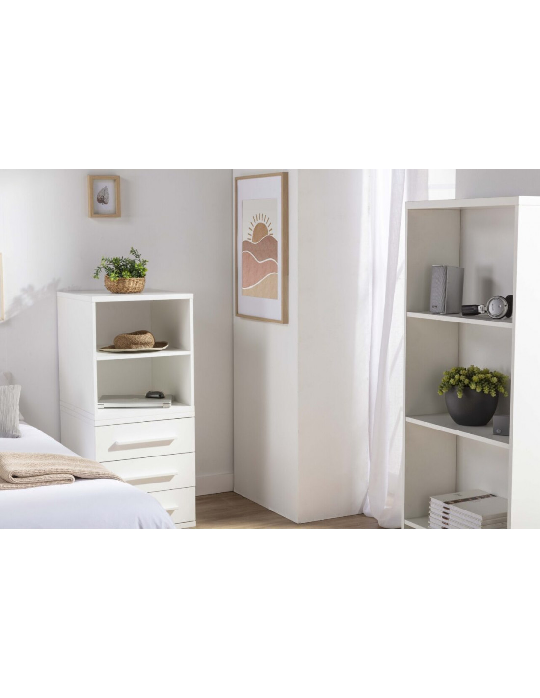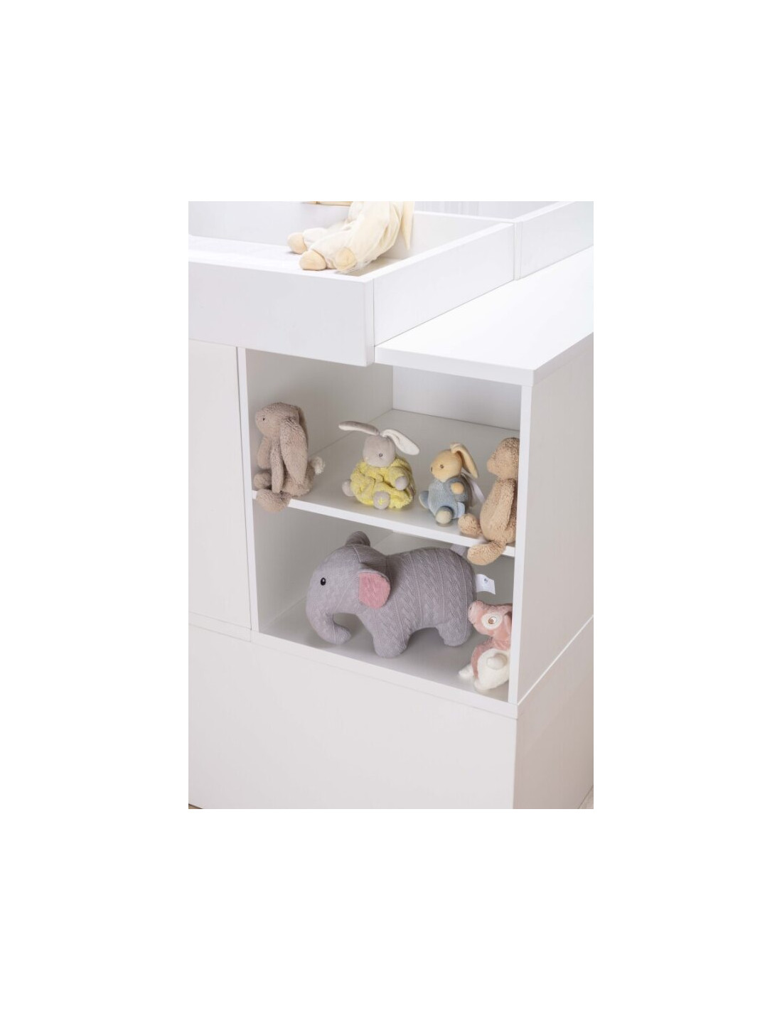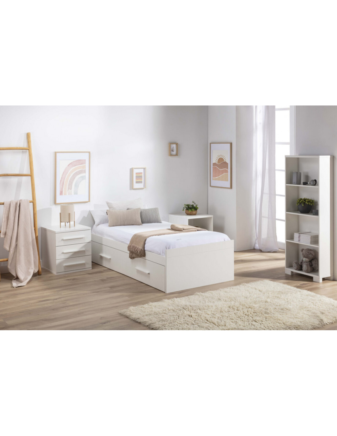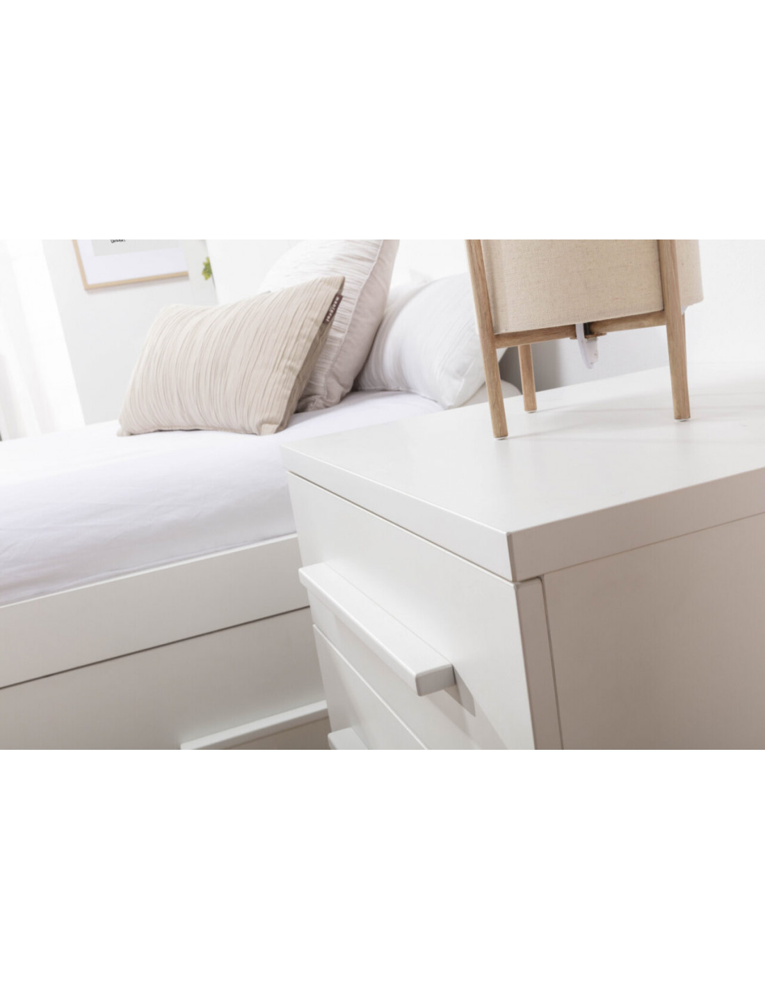 Cuna convertible en una cama: Cuna convertible en una cama. Incluye una cuna (70×140) que posteriormente se convierte en cama (90×190), una mesita cajonera, una mesita estantería, una estantería XL, una mesa escritorio XL y un cambiador.