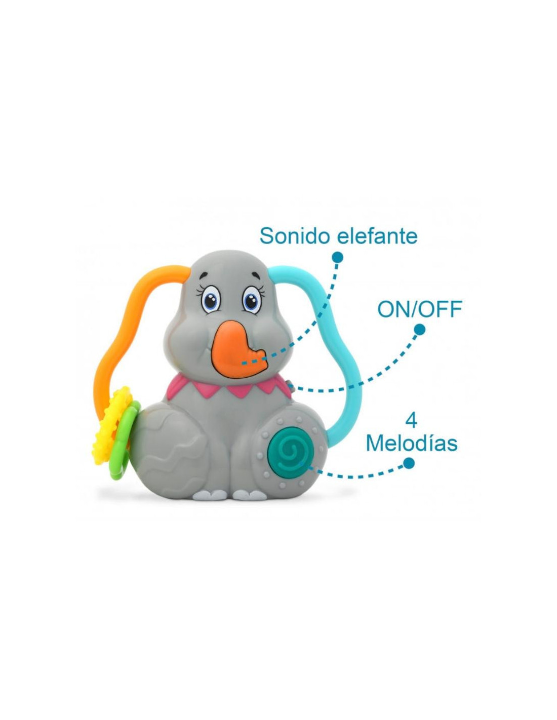 Si tu peque pulsa la trompa del animalito, emitirá los sonidos de un pequeño elefante y se ilumina. Y si pulsa la espiral de su patita, sonarán 4 melodías diferentes. Es muy fácil de sujetar por los más peques gracias a sus grandes orejas. También incluye distintas piezas-mordedor para que las muerde mientras juega.
