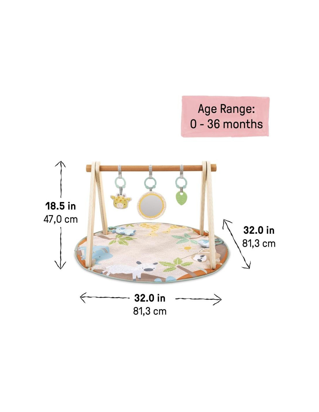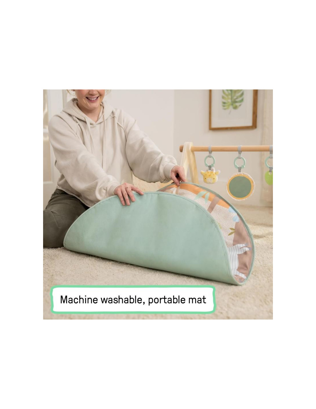 ¡A tu bebé le encantará el entretenimiento sinfín que le ofrece esta barra de juguetes y gimnasio con estructura en forma de A! Te encantará comprobar lo fácil que se monta, su perfecta integración en cualquier hogar moderno y su capacidad para ayudar a tu bebé a desenvolverse en las distintas etapas de su desarrollo, todo ello desde el suelo de tu salón. Este juego integral ayuda al bebé a pasar del tiempo boca abajo a la posición tumbada y al juego sentado. Todo ello mientras el bebé dispone de un amplio espacio para estirarse, juguetes para explorar y la comodidad que necesita para que le encante volver a la alfombra una y otra vez. Nuestra barra de juguetes es fácil de montar, ¡no se necesitan herramientas! Además, si quieres guardarla cuando tengas invitados o llevarla de viaje a casa de la abuela, desmontarla es pan comido. Para que puedas llevarla o guardarla donde quieras. Este set incluye 5 juguetes diseñados para el desarrollo sensorial del bebé: jirafa de peluche estrujable, hoja con textura, cebra de peluche, elefante de peluche estrujable y espejo de tela. Tu bebé podrá aprender a identificar sonidos, texturas y a sí mismo mientras está tumbado en su nuevo y cómodo espacio. Hay tres puntos para poder colgar los juguetes de la barra, así como dos puntos para fijar los juguetes a la alfombra. Además, cada juguete se desmonta y se vuelve a montar gracias a los eslabones en forme de C, para que puedas volver a engancharlo al cochecito, a la trona o a otros lugares favoritos del bebé. Diseñado para crecer con el bebé y pensado para que mamá y papá puedan usarlo con facilidad, ¡seguro que será un éxito en cualquier baby shower!