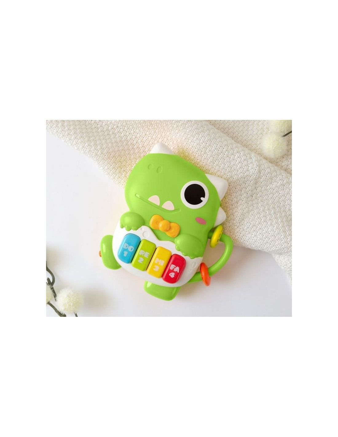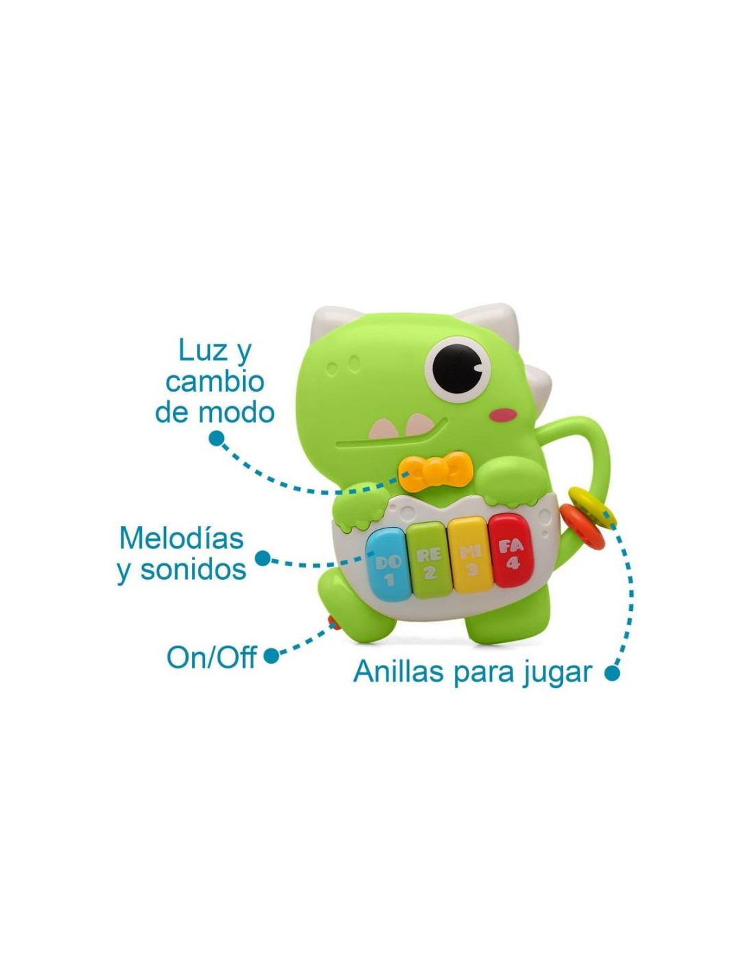 Este simpático dinosaurio verde, con su gran sonrisa y sus colores vivos, está pensado para convertirse en uno de los juguetes favoritos de tu peque. Basta con pulsar cualquiera de sus teclas para que empiece la diversión: notas de piano, sonidos de animales, melodías alegres y otros efectos que sorprenden y estimulan la curiosidad. Sus luces parpadean al ritmo de la música, haciendo que cada momento de juego sea una experiencia llena de color y energía.