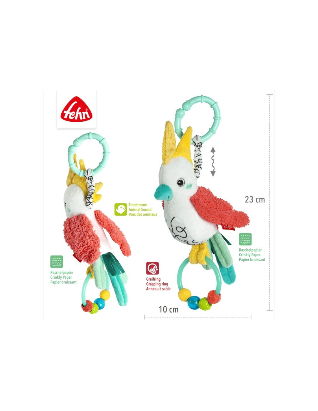 Diversión en casa o de viaje: el colorido pájaro Activity se puede enganchar al cochecito, a la sillita del coche o a la cama del bebé con la práctica anilla en forma de C.