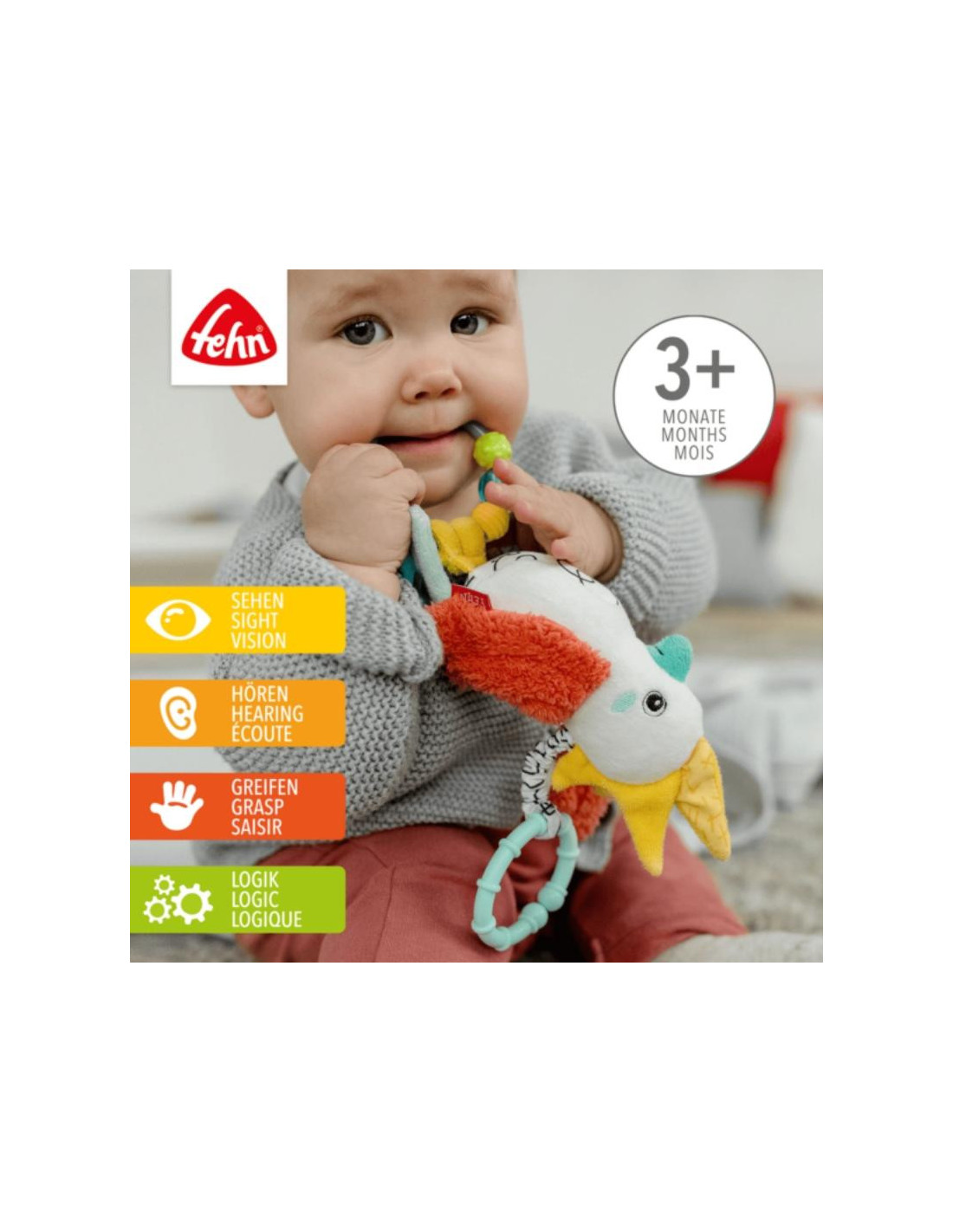Los colores vivos estimulan el sentido de la vista del bebé: los colores del arco iris, el susurro del papel, el aro con cuentas de colores y la mezcla de materiales l aden invitan al bebé a jugar y explorar, mientras que al mismo tiempo los divertidos gorjeos entrenan su oído