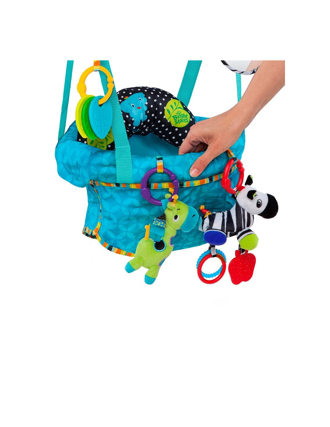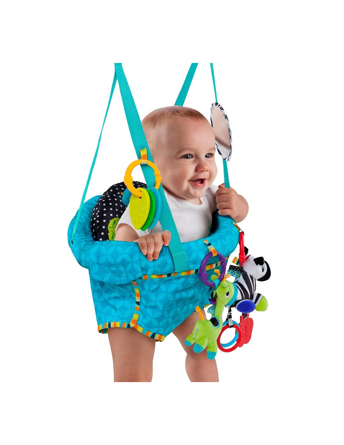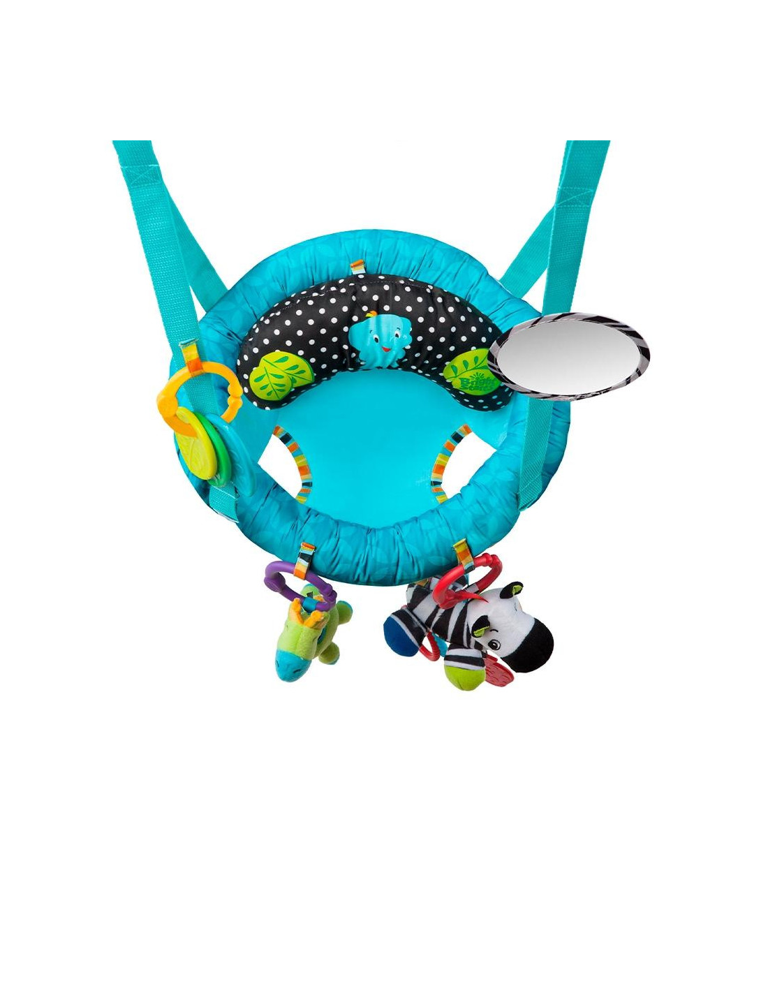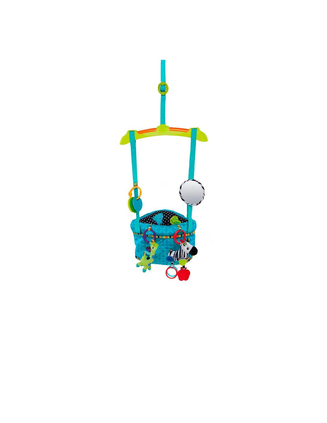 Incluye 4 juguetes: una jirafa y una cebra de peluche, una serie mordedores y un espejo, para no aburrirse entre salto y salto. Con correas ajustables para adaptar la altura al bebé a medida que crezca. La almohadilla de tejido suave sirve de apoyo extra para los bebés más pequeños.
