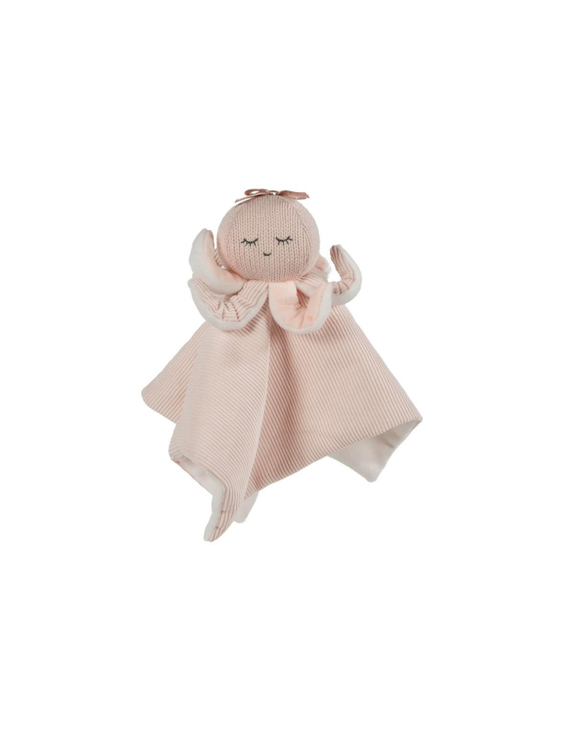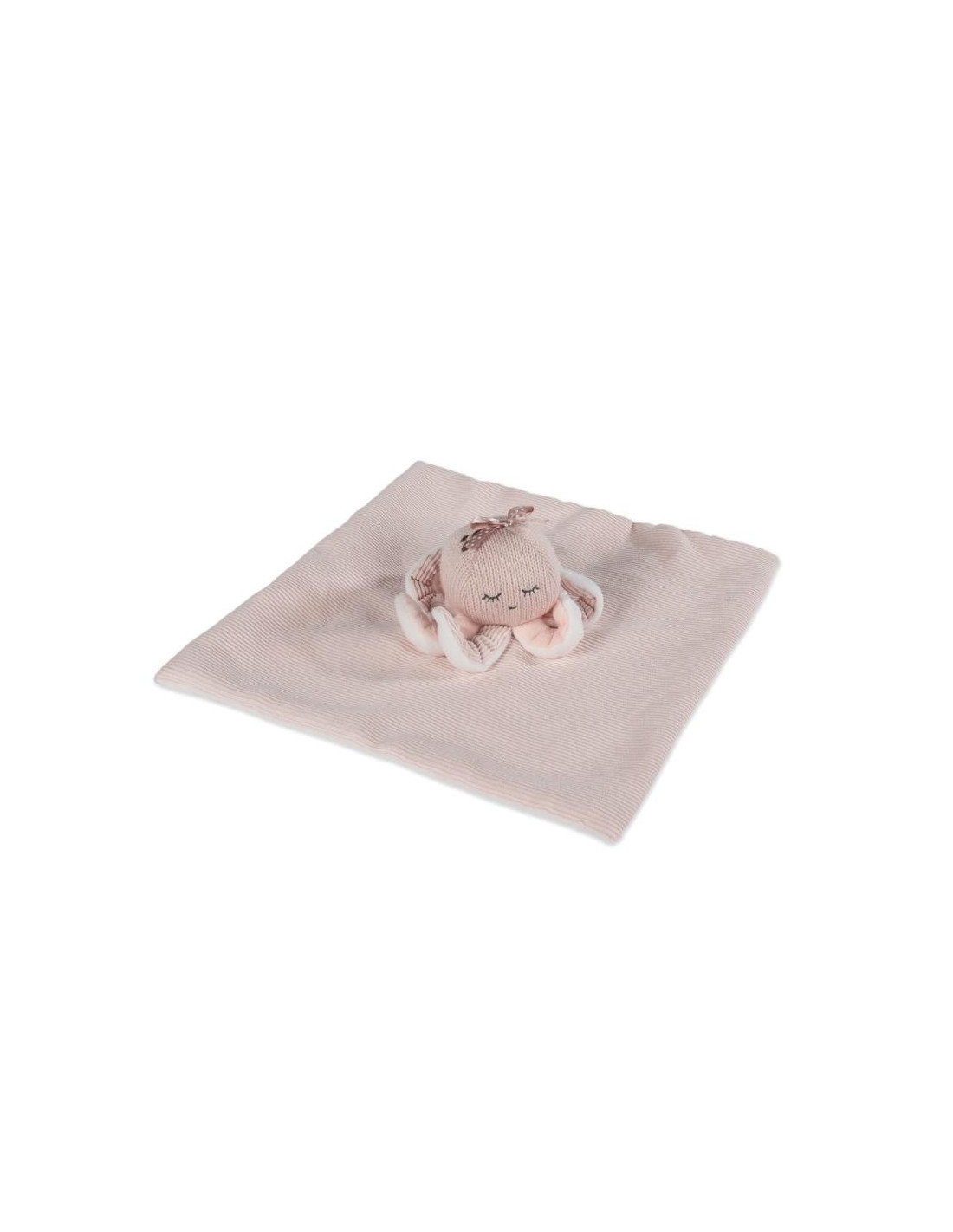 Doudou Pulpo Lola rosa para el bebé. Ayuda a relajar al bebé al tocarlo. Está fabricado en un 50% con poliéster reciclado. Cumple normativa de seguridad en juguetes EN-71. Medidas: 28×28 cm.