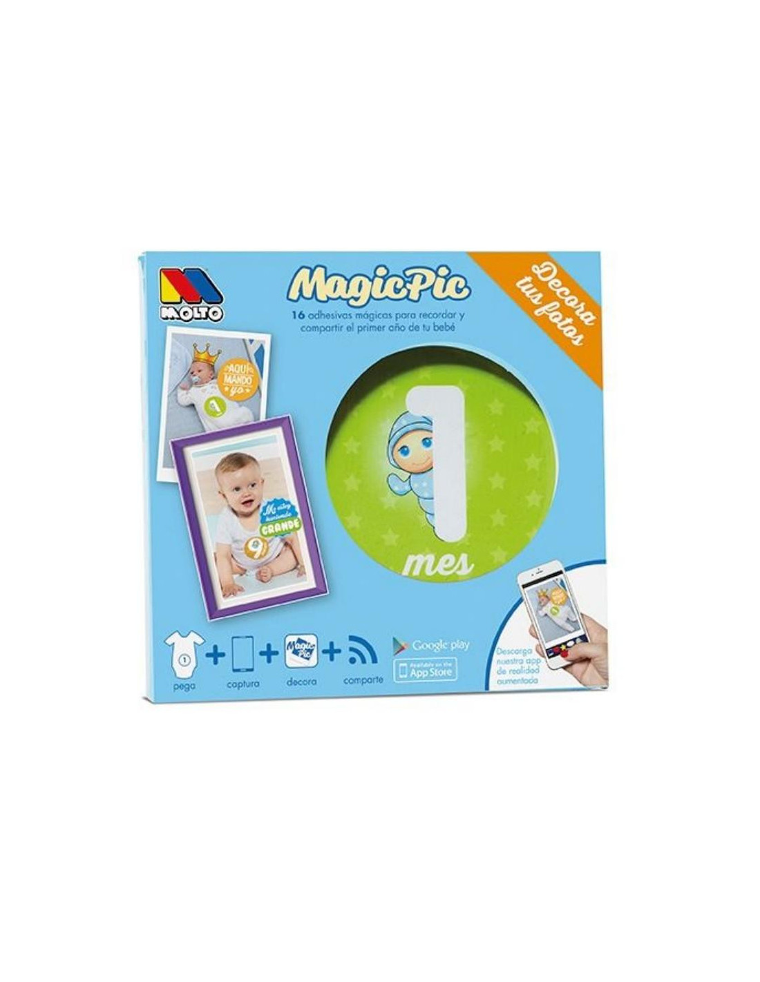 Crear los mejores recuerdos de tu embarazo o de los primeros meses de tu bebé nunca fue tan fácil y divertido... Usando nuestras etiquetas MagicPic con realidad aumentada y la aplicación Moltó MagicPic podrás conseguir estupendas imágenes y compartirlas de una forma rápida y sencilla. Coloca las etiquetas adhesivas en el lugar que más te guste, y verás cómo comienza la magia. En tu dispositivo móvil aparecerá la realidad aumentada, captura el momento que más te divierta y decórala con nuestros iconos personalizados... ¡Así de fácil!