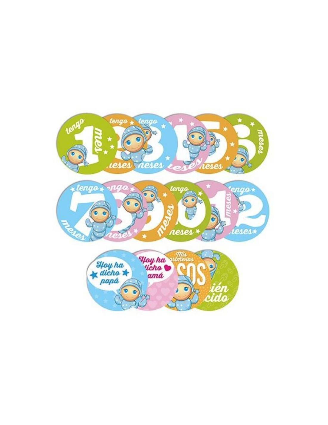 12 adhesivas con los primeros 12 meses del niño, 4 adhesivas con frases de bebés.
