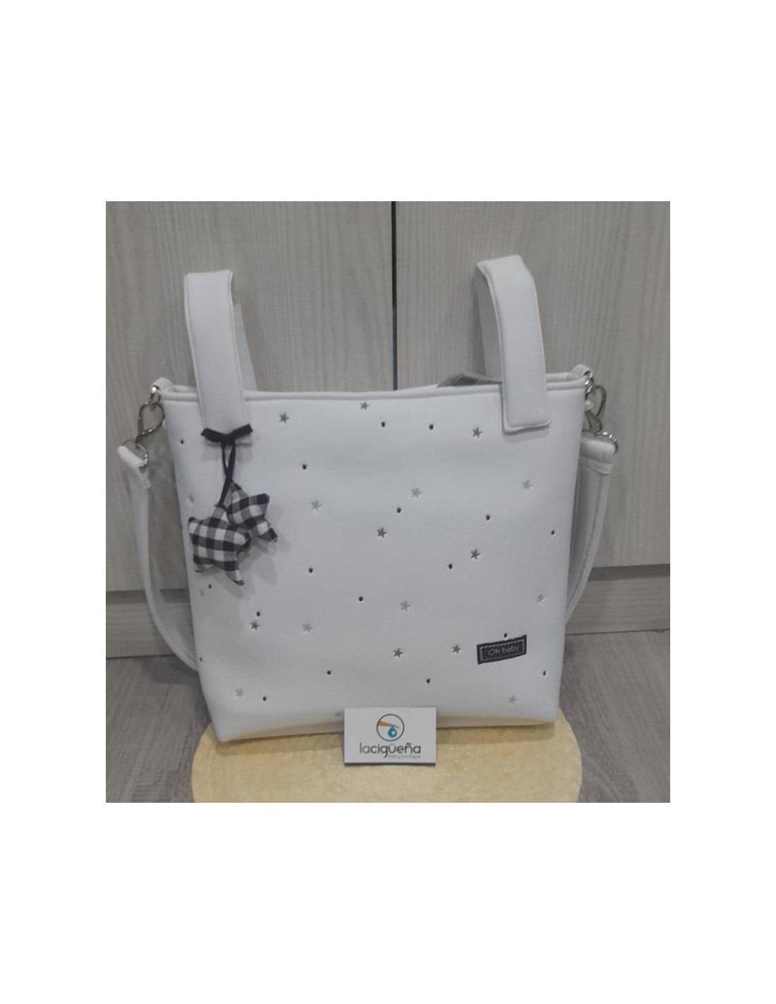 es un bolso de carrito o silla en polipiel con asa larga para poder colgarlo del hombro, además es estampado con topitos y estrellitas. Ideal para otoño e invierno ya que es totalmente impermeable.