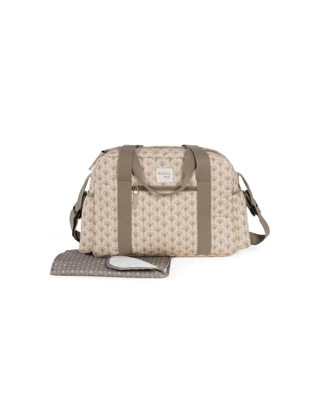Bolso cambiador Indian Sand con estampado geométrico en tono rosa/gris para silla de paseo que incluye cambiador para bebe. Bolsa canastilla muy ligera, resistente y de gran capacidad para llevar todo lo necesario para el paseo del bebe. Tiene multiples bolsillos para poder tener todo ordenado. Dispone en el exterior de dos bolsillos laterales para botellas o biberones y un bolsillo con cremallera frontal. En el interior incopora un bolsillo plastificado para la ropa húmeda, un bolsillo térmico para biberones y dos bolsillos para lo que necesites tener más a mano. La bolsa tiene un sistema universal de fijación, con 2 asas cortas ajustables que facilita la colocación en cualquier modelo de silla de paseo. También incorpora una asa larga para poder colgarla en el hombro y asas cortas para cogerla con la mano. Gran calidad y mucho estilo. Fabricada en un material resistente y de fácil limpieza. Walking Mum protege a tu bebé utilizando los mejores tejidos, libres de colorantes azoicos y sustancias nocivas para la salud. Nuestra colección Walking Mum está diseñada con un particular sello de estilo urbano y moderno que no pasa desapercibido, para vestir diferente los paseos con tu bebé. Las bolsas de maternidad de esta línea son más sport y prácticas, especialmente pensadas en mamás y papás modernos que aprecian los diseños más actuales y en tendencia sin dejar de lado la calidad y la funcionalidad de los accesorios que complementan y hacen más cómodos todos los paseos con sus bebés. Especificaciones: Materiales: 100% algodón con tratamiento waterpfoof. Medidas: 52X31X13 cm.