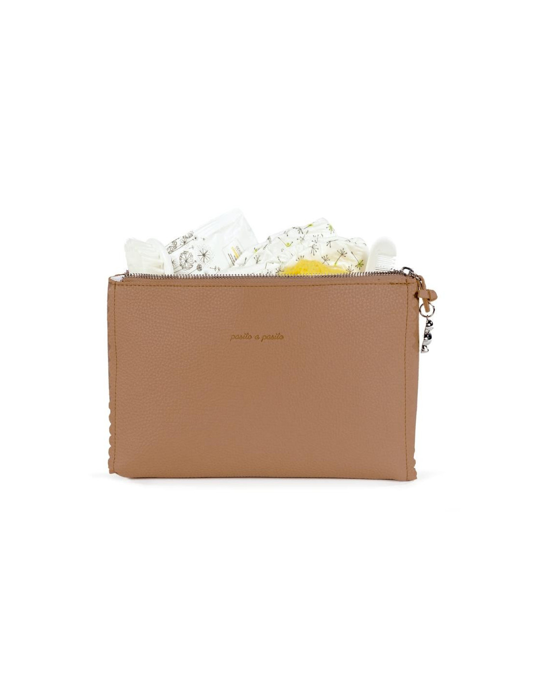 El neceser de bebé Icon Caramel de Pasito a pasito es un bolso pequeño especialmente pensado para llevar todos los productos de aseo de nuestro bebé al salir de casa. Es un modelo único con mucho estilo para adecuarse a lo que necesitas. Está elaborado en resistente y suave polipiel y com una forma para acomodar fácilmente en el bolso canastilla a un lado. Es un diseño bonito, simple y cómodo que ofrece un espacio pequeño pero preciso para llevar justo lo que necesitas para la higiene de tu bebé, peine, lociones y otros objetos que por ser tan pequeños a veces se pierden dentro del bolso canastilla. Cuenta con un cierre de cremallera de fácil apertura. Acabados de calidad. Está fabricado con materiales de gran calidad, libres de colorantes azoicos, ftalatos y sustancias nocivas para la salud. Además se puede lavar a mano o a máquina a temperaturas de hasta 30º. Los productos para bebé de Pasito a Pasito cuentan con un diseño muy diferente a todas las demás. Sus colecciones se caracterizan por el trabajo al detallada, pensadas siempre desde un punto de vista práctico. Utilizan materiales de primera calidad para remarcar la elegancia y la armonía en cada una de sus piezas. Nuestros modelos son exclusivos y de estilo inconfundible, pensados en madres actuales que gozan de buen gusto y que aprecian los detalles tanto como nosotros. Especificaciones: Materiales: Eco-leather. Color: Camel. Medidas: 21X18X8 cm.