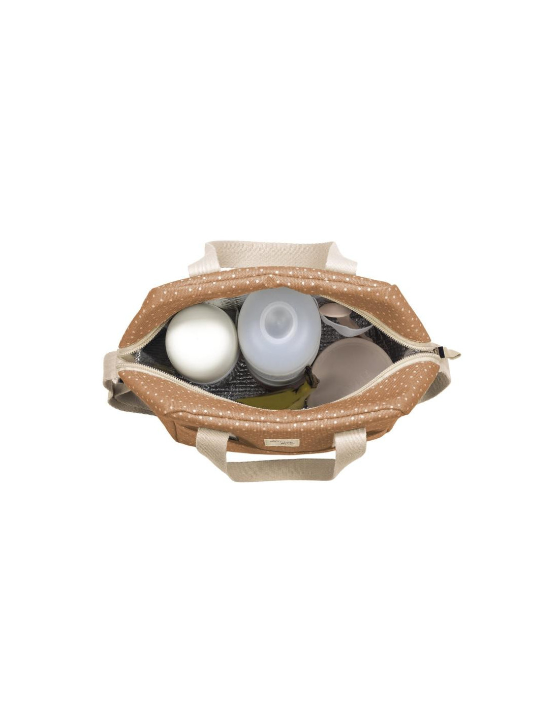 Bolsa térmica para biberones Poppy Canela de topitos. Mantiene la temperatura durante 4 horas. También incorpora una asa larga para poder colgarla en el hombro y asa corta de mano. Gran calidad y mucho estilo. Fabricada en un material resistente y de fácil limpieza. Walking Mum protege a tu bebé utilizando los mejores tejidos, libres de colorantes azoicos y sustancias nocivas para la salud. Nuestra colección Walking Mum guarda toda la calidad de la marca Pasito a Pasito pero con un particular sello de estilo urbano y moderno que no pasa desapercibido, para vestir diferente los paseos con tu bebé. Las bolsas de maternidad de esta línea son más sport y prácticas, especialmente pensadas en mamás y papás modernos que aprecian los diseños más actuales y en tendencia sin dejar de lado la calidad y la funcionalidad de los accesorios que complementan y hacen más cómodos todos los paseos con sus bebés. Especificaciones: Materiales: 100% algodón plastificado. Medidas: 20X22X12 cm.