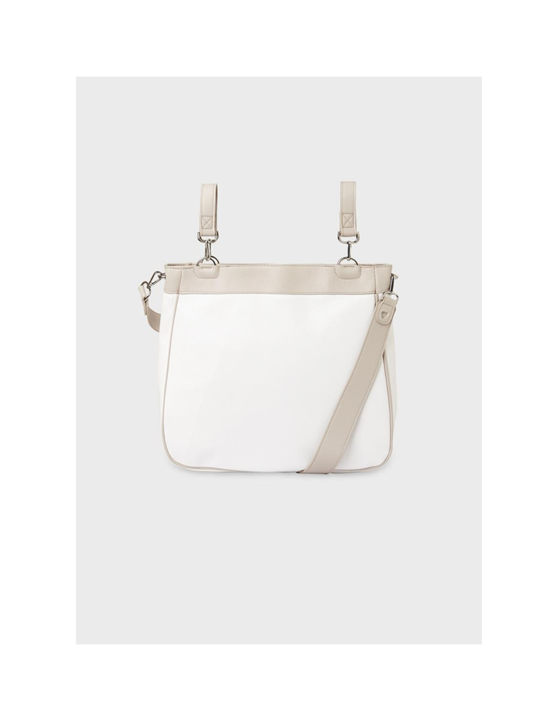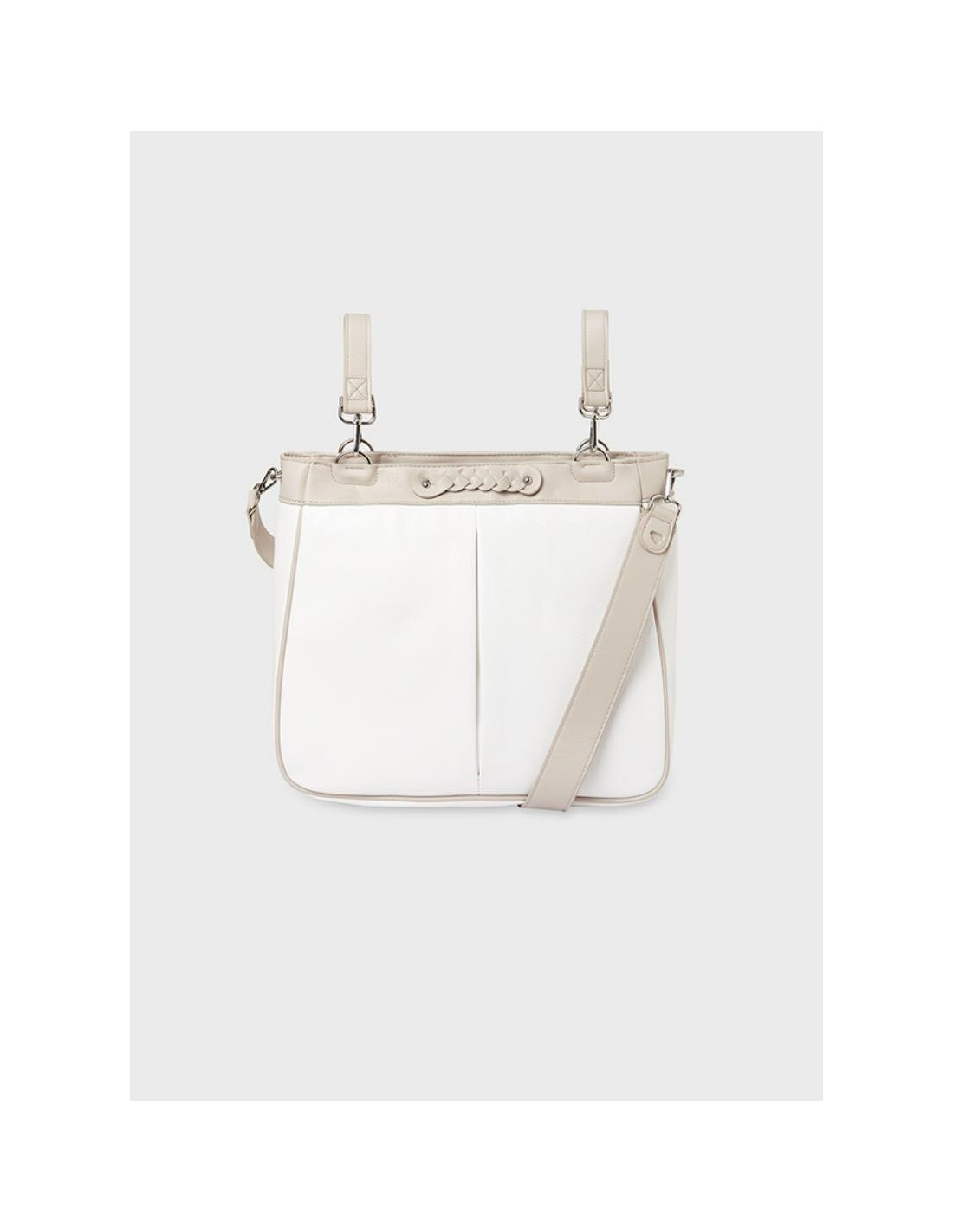 Bolso de tipo panera para carrito de bebé, perfecto para llevar con estilo todo lo necesario durante un paseo con tu pequeño/a. Cierre con cremallera. Moderno exterior de polipiel. Incorpora asas de colgado desmontables, pudiendo engancharlo fácilmente a la sillita de tu bebé. Elementos de adorno: detalles trenzados. Este artículo tiene unas dimensiones de 31 x 37 x 13 cm.