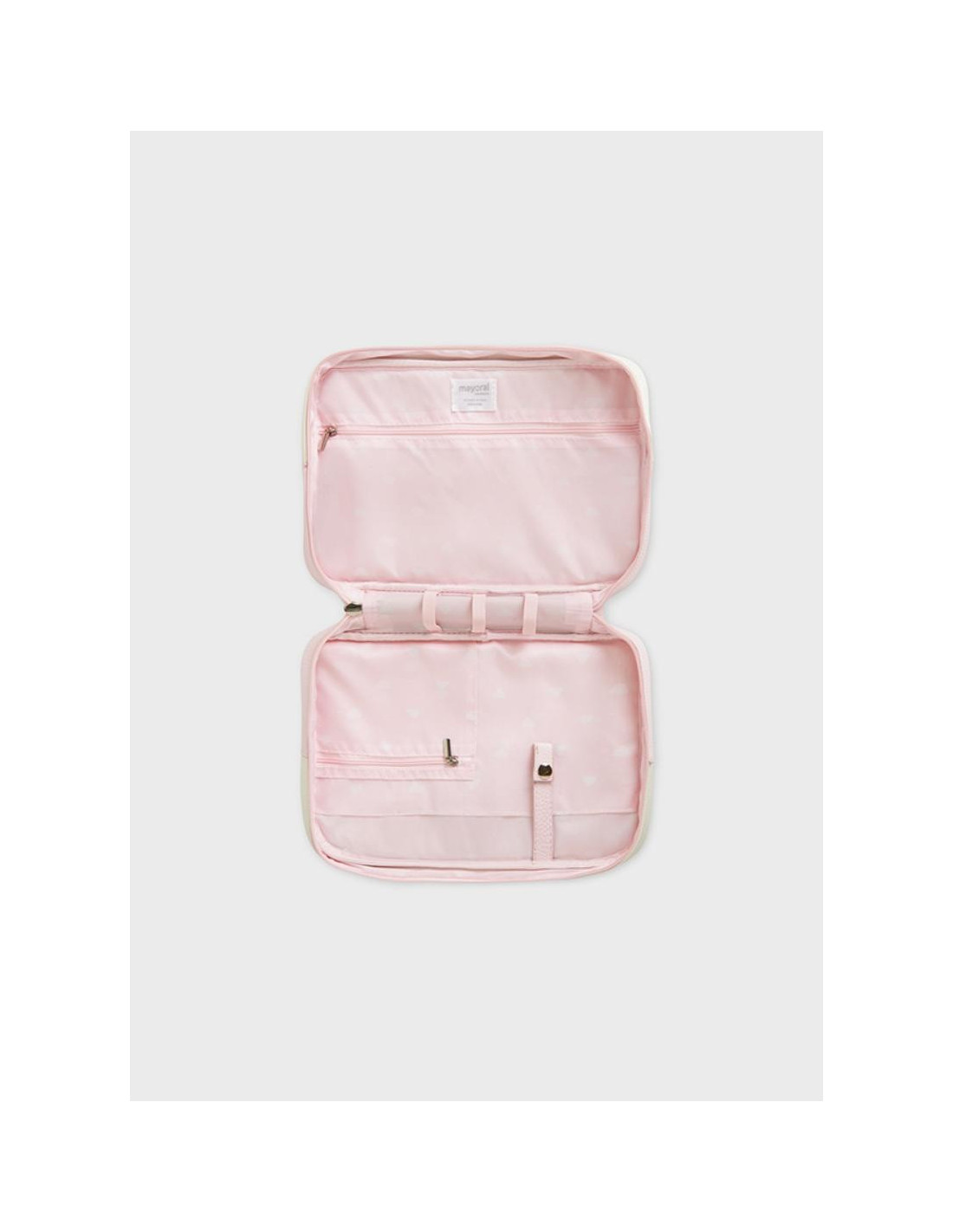 Neceser-organizador ideal para guardar artículos básicos de aseo e higiene de tu bebé, como cremas y lociones. Cierre con cremallera. Mezcla de tejidos combinados para lograr un diseño único y diferente. Elementos de adorno: logotipo decorativo. Este artículo tiene unas dimensiones de 17 x 27 x 7cm.