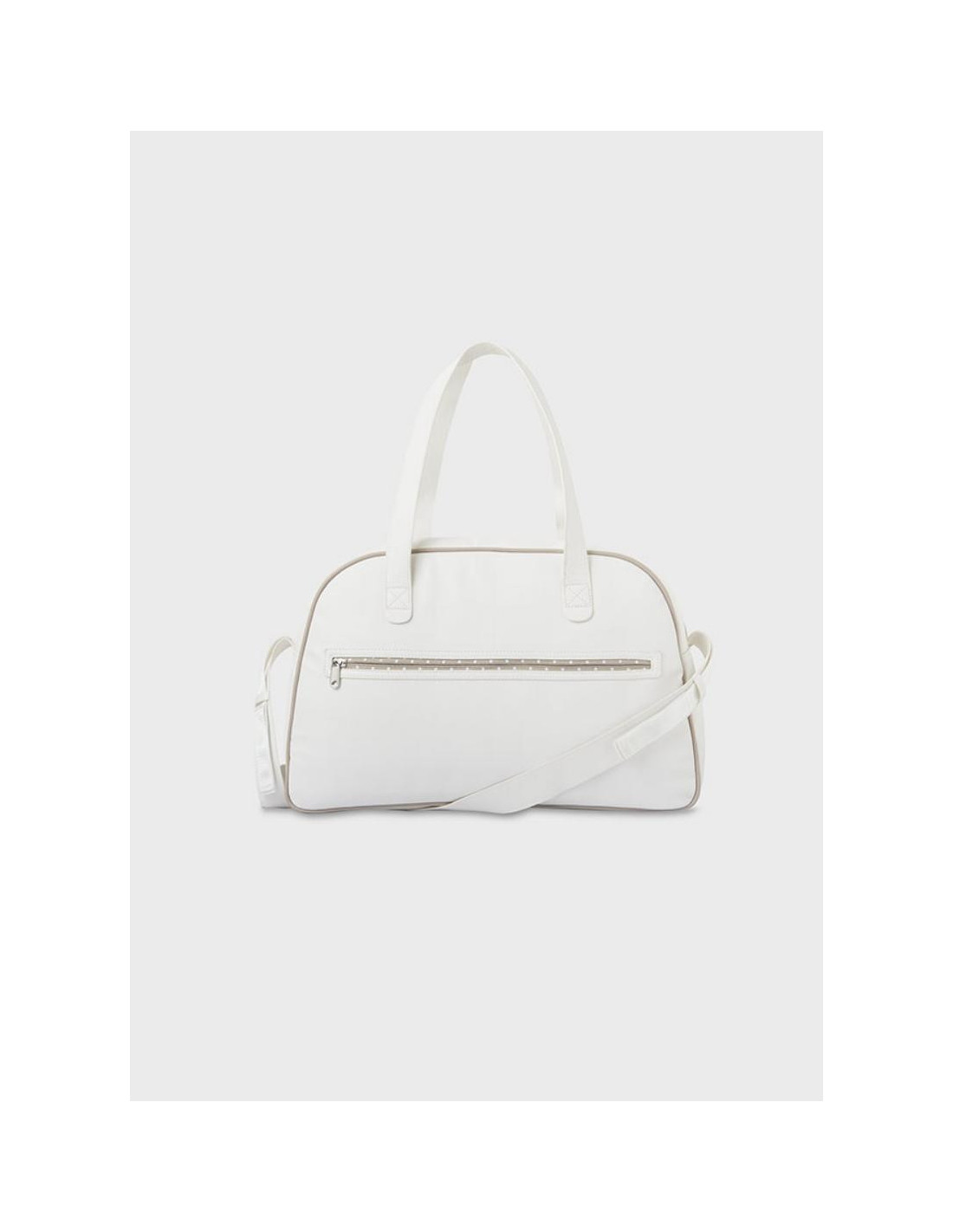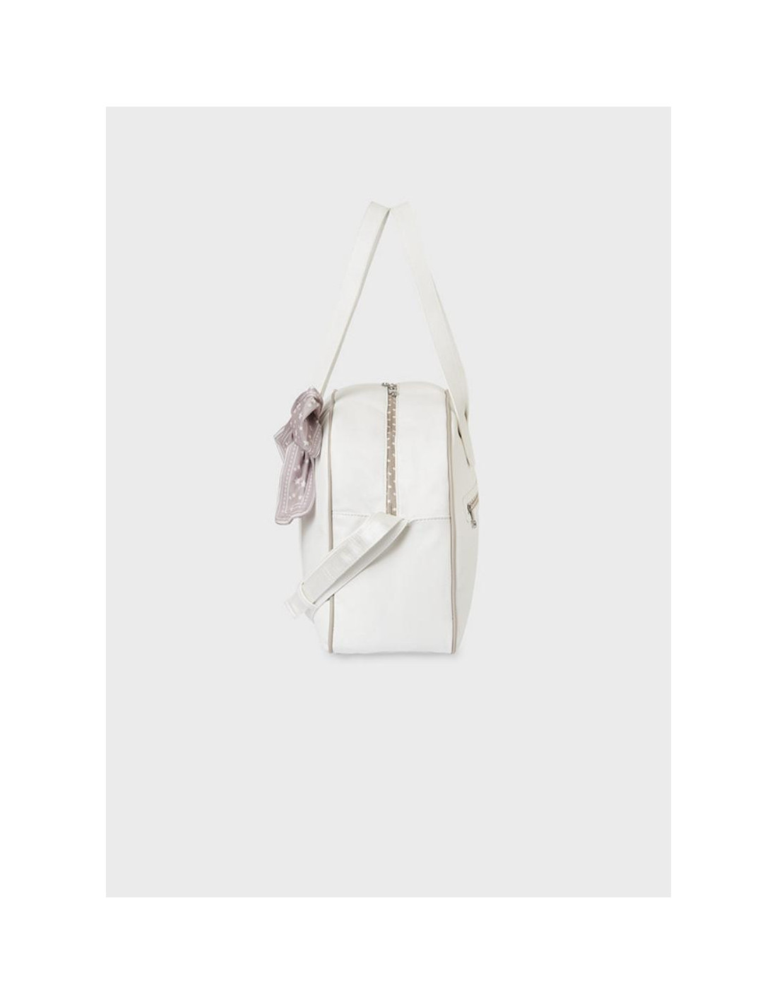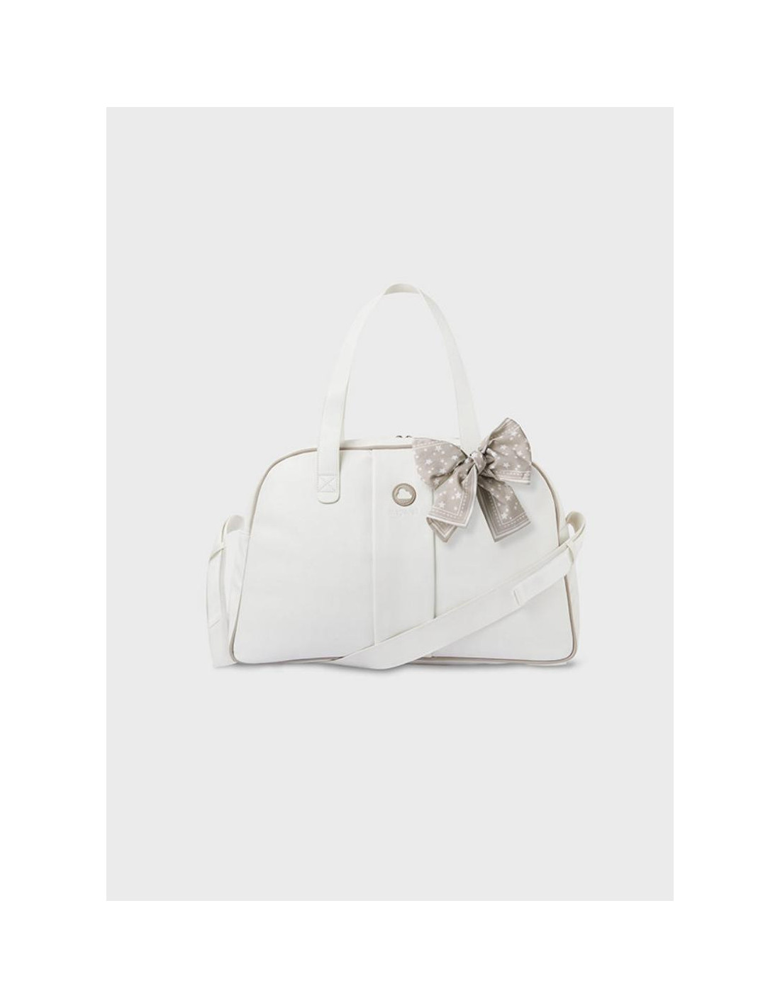 Espacioso bolso de maternidad pensado para ayudarte en el día a día y guardar todo lo necesario para tu bebé. Cierre con cremallera. Cuenta con asas de mano, al hombro y de colgado, las dos últimas de diseño desmontable para una mejor personalización en el uso. Elementos de adorno: lazada decorativa. Este complemento está diseñado a juego con una de nuestras colecciones de bolsos y accesorios. Pertenece a una línea de artículos combinables con la colección de Newborn. Dimensiones 31 x 47 x 16 cm.