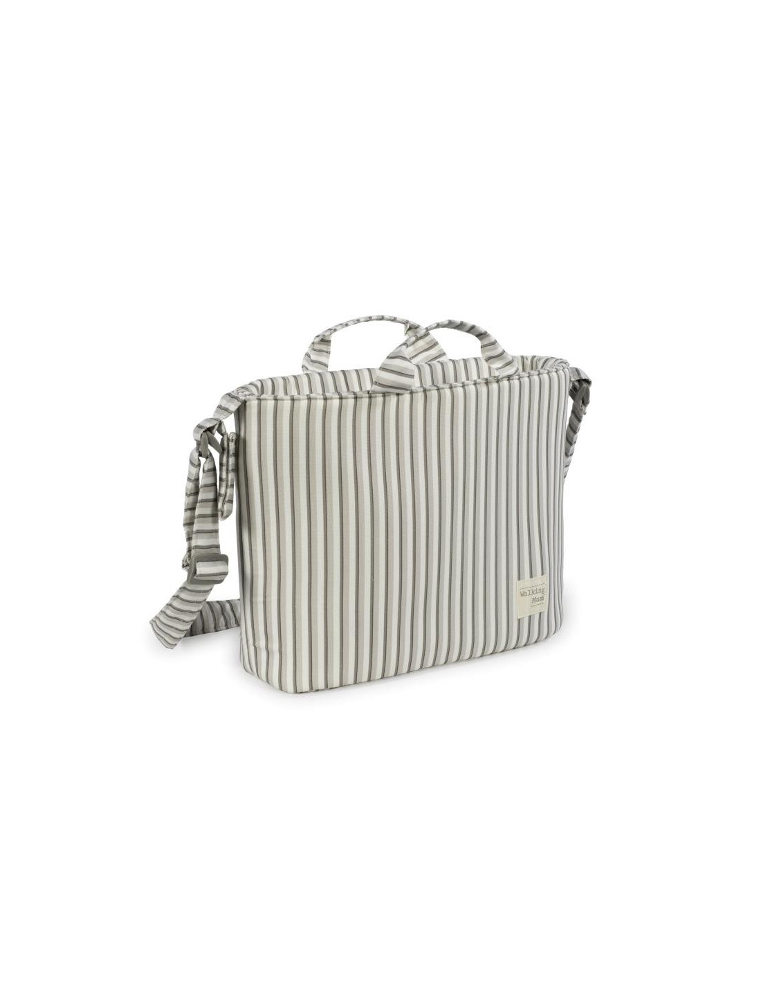 Bolso cambiador Botton con estampado de rayas para silla de paseo que incluye cambiador para bebé. Bolsa canastilla muy ligera, resistente y de gran capacidad para llevar todo lo necesario para el paseo del bebé. Tiene múltiples bolsillos para poder tener todo ordenado. En el interior incorpora un bolsillo plastificado para la ropa húmeda, un bolsillo térmico para biberones y dos bolsillos para lo que necesites tener más a mano. La bolsa tiene un sistema universal de fijación, con 2 asas cortas ajustables que facilita la colocación en cualquier modelo de silla de paseo. También incorpora una asa larga para poder colgarla en el hombro y asas cortas para cogerla con la mano. Gran calidad y mucho estilo. Fabricada en algodón 100% con un tratamiento waterproof, de fácil limpieza a mano o a máquina a 30 °C. Walking Mum protege a tu bebé utilizando los mejores tejidos, libres de colorantes azoicos y sustancias nocivas para la salud. Nuestra colección Walking Mum está diseñada con un particular sello de estilo urbano y moderno que no pasa desapercibido, para vestir diferente los paseos con tu bebé. Las bolsas de maternidad de esta línea son más sport y prácticas, especialmente pensadas en mamás y papás modernos que aprecian los diseños más actuales y en tendencia sin dejar de lado la calidad y la funcionalidad de los accesorios que complementan y hacen más cómodos todos los paseos con sus bebés. Especificaciones: Materiales: 100% algodón con tratamiento waterproof. Medidas: 44 x 29 x 12 cm.