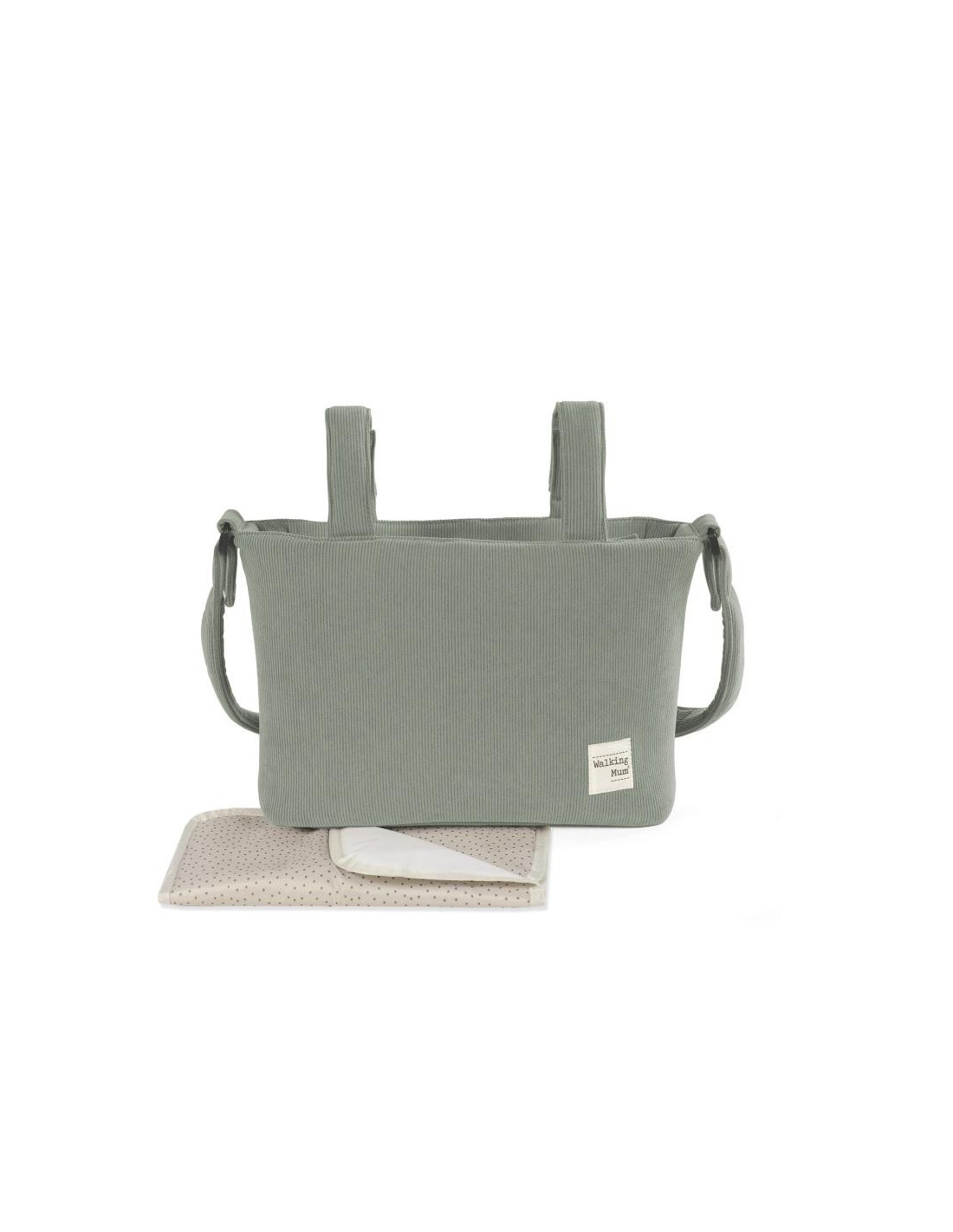 Bolso cambiador Gala Mint de pana para silla de paseo que incluye cambiador para bebe. Bolsa canastilla muy ligera, resistente y de gran capacidad para llevar todo lo necesario para el paseo del bebe. Tiene multiples bolsillos para poder tener todo ordenado. En el interior incopora un bolsillo plastificado para la ropa húmeda, un bolsillo térmico para biberones y dos bolsillos para lo que necesites tener más a mano. La bolsa tiene un sistema universal de fijación, con 2 asas cortas que facilita la colocación en la silla de paseo. También incorpora una asa larga para poder colgarla en el hombro . Gran calidad y mucho estilo. Fabricada en algodón 100% con un tratamiento waterproof, de fácil limpieza a mano o a máquina a 30 °C. Walking Mum protege a tu bebé utilizando los mejores tejidos, libres de colorantes azoicos y sustancias nocivas para la salud. Nuestra colección Walking Mum está diseñada con un particular sello de estilo urbano y moderno que no pasa desapercibido, para vestir diferente los paseos con tu bebé. Las bolsas de maternidad de esta línea son más sport y prácticas, especialmente pensadas en mamás y papás modernos que aprecian los diseños más actuales y en tendencia sin dejar de lado la calidad y la funcionalidad de los accesorios que complementan y hacen más cómodos todos los paseos con sus bebés. Especificaciones: Materiales: 100% algodón con tratamiento waterpfoof. Medidas: 36x23x11 cm.
