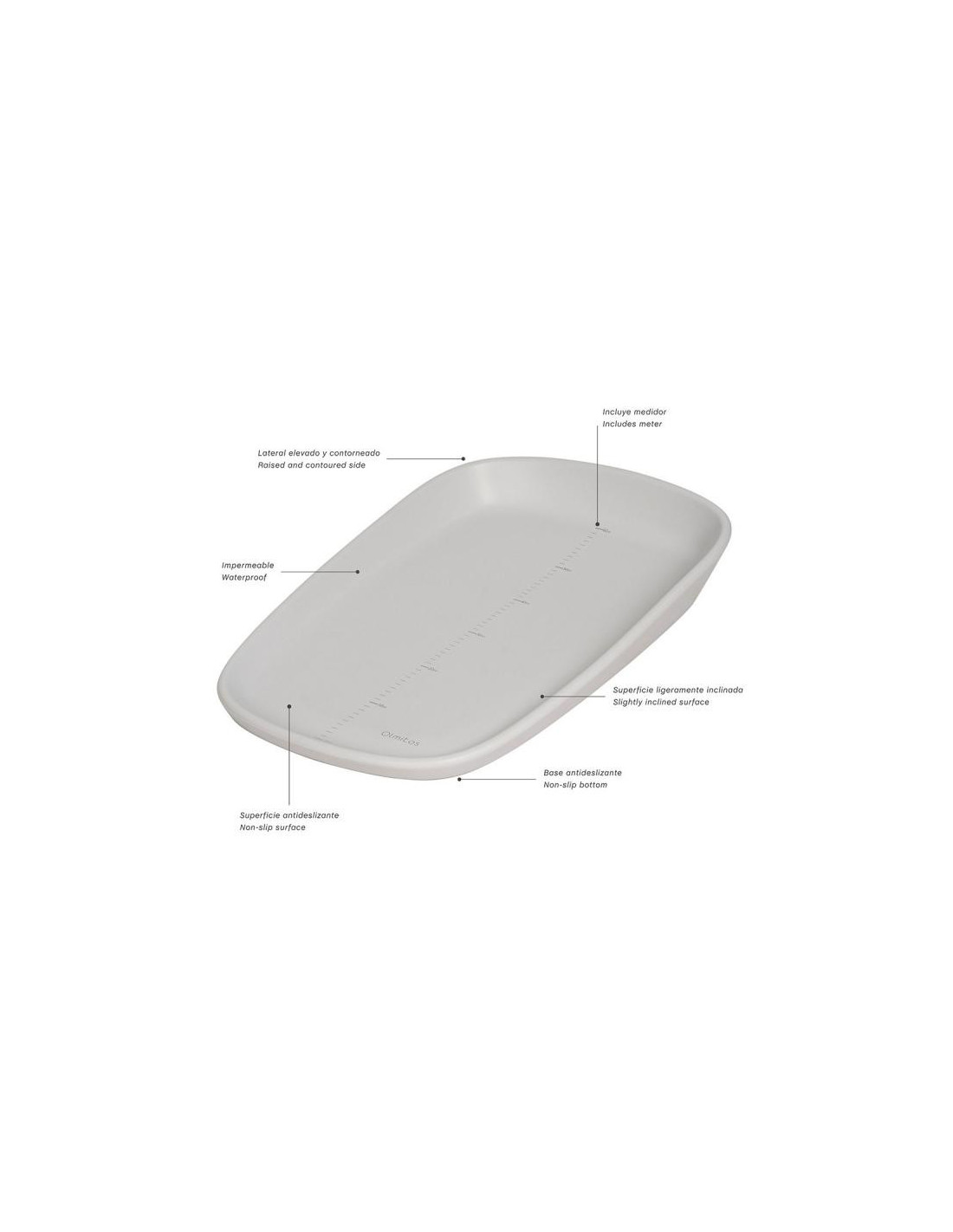 - Superficie y base antideslizante, ligeramente inclinada, y con lateral elevado y contorneado.