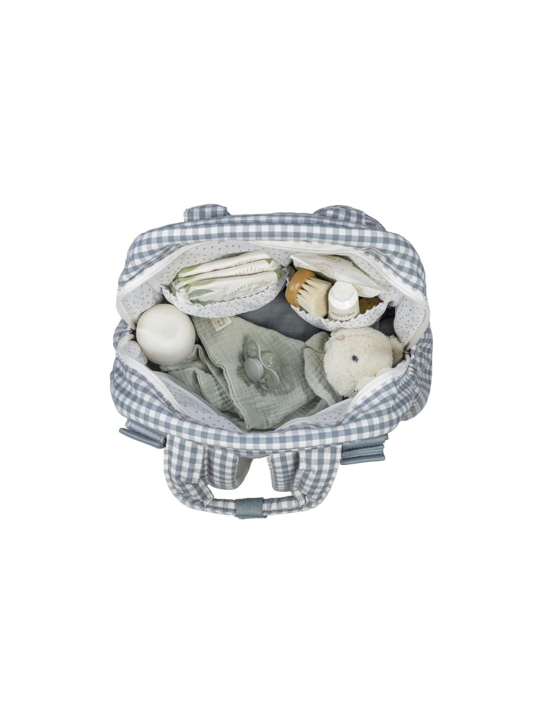Una bolsa canastilla y mochila al mismo tiempo, ideal para llevar tus cosas y las de tu bebé, con mucho estilo, a todos sus paseos. La mochila Praliné Vichy Matcha está fabricada con un tratamiento water resistant. La mochila para silla de paseo es un modelo multifunción muy ligero, resistente y de gran capacidad para llevar todo lo necesario en el paseo del bebe. Su esquema ofrece 3 bolsillos exteriores y 4 interiores para poder tener todo ordenado y a mano. En el exterior tiene un bolsillo frontal con cierre de cremallera y dos bolsillos laterales para biberones o botellas. En el interior incopora un bolsillo plastificado para la ropa húmeda, un bolsillo térmico para biberones y dos bolsillos para lo que necesites tener más a mano. Incluye un cambiador a juego con el bolso de maternidad. El bolso incluye 2 asas cortas ajustables que facilitan la colocación en cualquier modelo de silla de paseo, asas de mano y correas acolchadas para colgar en los hombros hacia la espalda, sin generar molestias por el peso. Gran calidad y mucho estilo. Fabricada con un tratamiento water resistant, de fácil limpieza a mano o a máquina a 30 °C. Walking Mum protege a tu bebé utilizando los mejores tejidos, libres de colorantes azoicos y sustancias nocivas para la salud. Nuestra colección Walking Mum guarda toda la calidad de la marca Pasito a Pasito pero con un particular sello de estilo urbano y moderno que no pasa desapercibido, para vestir diferente los paseos con tu bebé. Las bolsas de maternidad de esta línea son más sport y prácticas, especialmente pensadas en mamás y papás modernos que aprecian los diseños más actuales y en tendencia sin dejar de lado la calidad y la funcionalidad de los accesorios que complementan y hacen más cómodos todos los paseos con sus bebés. Especificaciones: Materiales: 65% algodón/35% poliéster con tratamiento waterpfoof. Medidas: 37X28X13 cm.