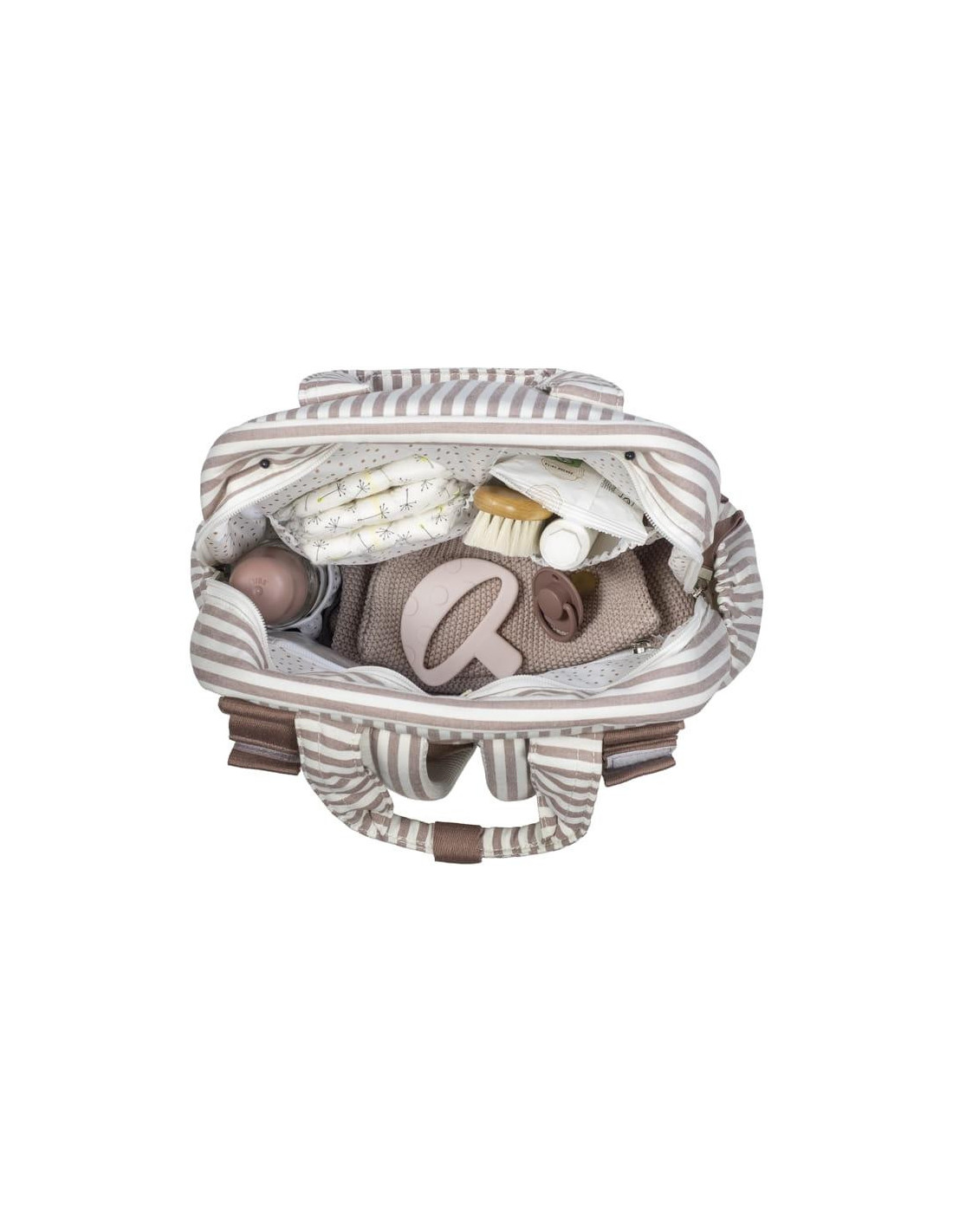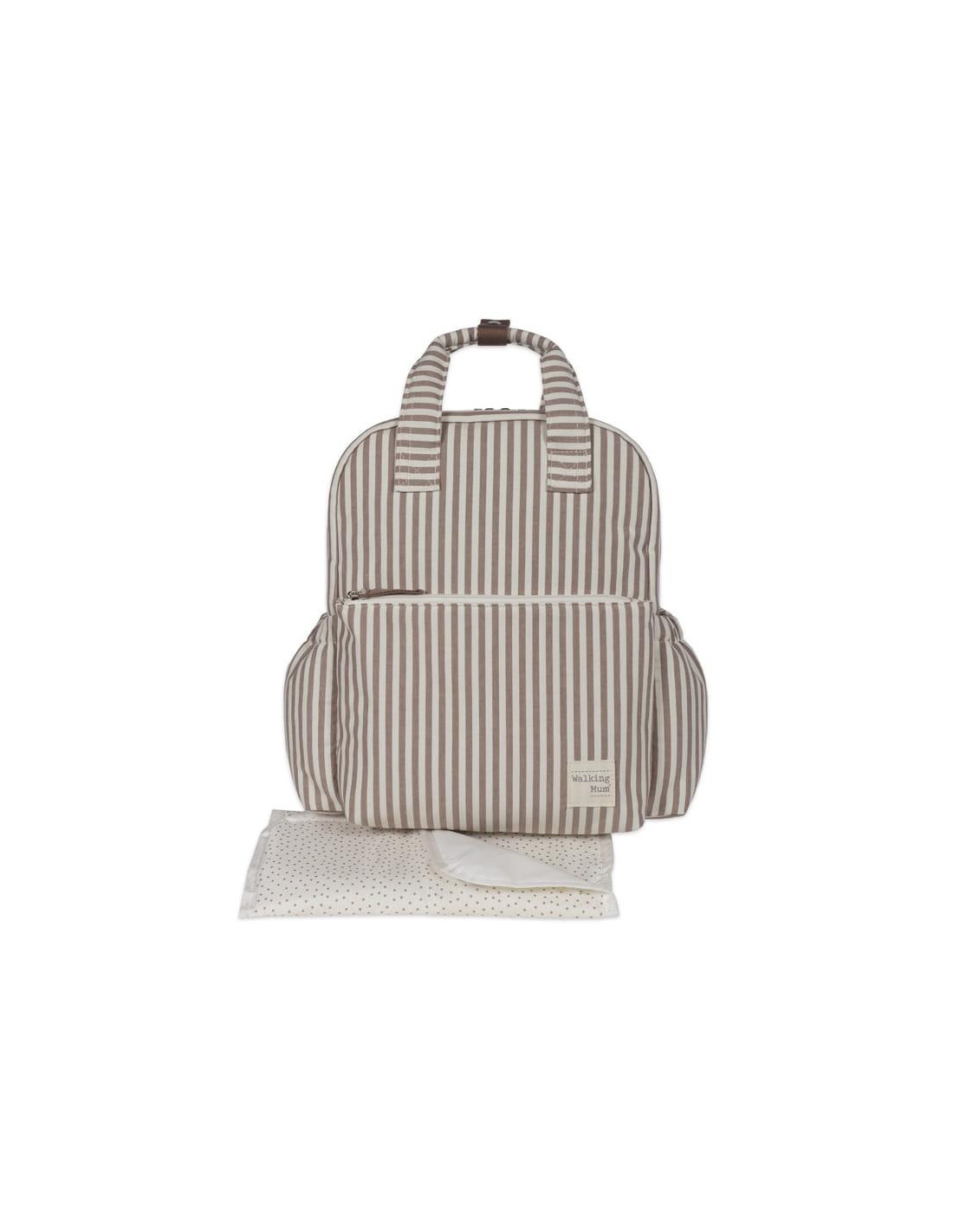 Una bolsa canastilla y mochila al mismo tiempo, ideal para llevar tus cosas y las de tu bebé, con mucho estilo, a todos sus paseos. La mochila Praliné Rayas Matcha está fabricada con un tratamiento water resistant. La mochila para silla de paseo es un modelo multifunción muy ligero, resistente y de gran capacidad para llevar todo lo necesario en el paseo del bebe. Su esquema ofrece 3 bolsillos exteriores y 4 interiores para poder tener todo ordenado y a mano. En el exterior tiene un bolsillo frontal con cierre de cremallera y dos bolsillos laterales para biberones o botellas. En el interior incopora un bolsillo plastificado para la ropa húmeda, un bolsillo térmico para biberones y dos bolsillos para lo que necesites tener más a mano. Incluye un cambiador a juego con el bolso de maternidad. El bolso incluye 2 asas cortas ajustables que facilitan la colocación en cualquier modelo de silla de paseo, asas de mano y correas acolchadas para colgar en los hombros hacia la espalda, sin generar molestias por el peso. Gran calidad y mucho estilo. Fabricada con un tratamiento water resistant, de fácil limpieza a mano o a máquina a 30 °C. Walking Mum protege a tu bebé utilizando los mejores tejidos, libres de colorantes azoicos y sustancias nocivas para la salud. Nuestra colección Walking Mum guarda toda la calidad de la marca Pasito a Pasito pero con un particular sello de estilo urbano y moderno que no pasa desapercibido, para vestir diferente los paseos con tu bebé. Las bolsas de maternidad de esta línea son más sport y prácticas, especialmente pensadas en mamás y papás modernos que aprecian los diseños más actuales y en tendencia sin dejar de lado la calidad y la funcionalidad de los accesorios que complementan y hacen más cómodos todos los paseos con sus bebés. Especificaciones: Materiales: 65% algodón/35% poliéster con tratamiento waterpfoof. Medidas: 37X28X13 cm.