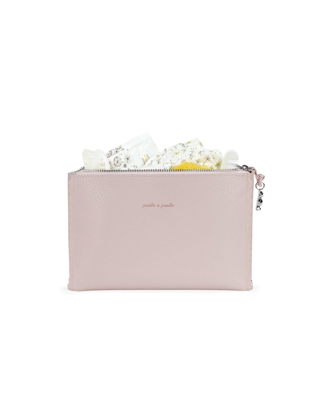 El neceser de bebé Icon Rose de Pasito a pasito es un bolso pequeño especialmente pensado para llevar todos los productos de aseo de nuestro bebé al salir de casa. Es un modelo único con mucho estilo para adecuarse a lo que necesitas. Está elaborado en resistente y suave polipiel y com una forma para acomodar fácilmente en el bolso canastilla a un lado. Es un diseño bonito, simple y cómodo que ofrece un espacio pequeño pero preciso para llevar justo lo que necesitas para la higiene de tu bebé, peine, lociones y otros objetos que por ser tan pequeños a veces se pierden dentro del bolso canastilla. Cuenta con un cierre de cremallera de fácil apertura. Acabados de calidad. Está fabricado con materiales de gran calidad, libres de colorantes azoicos, ftalatos y sustancias nocivas para la salud. Además se puede lavar a mano o a máquina a temperaturas de hasta 30º. Los productos para bebé de Pasito a Pasito cuentan con un diseño muy diferente a todas las demás. Sus colecciones se caracterizan por el trabajo al detallada, pensadas siempre desde un punto de vista práctico. Utilizan materiales de primera calidad para remarcar la elegancia y la armonía en cada una de sus piezas. Nuestros modelos son exclusivos y de estilo inconfundible, pensados en madres actuales que gozan de buen gusto y que aprecian los detalles tanto como nosotros. Especificaciones: Materiales: Eco-leather. Color: Rosa. Medidas: 21X18X8 cm.