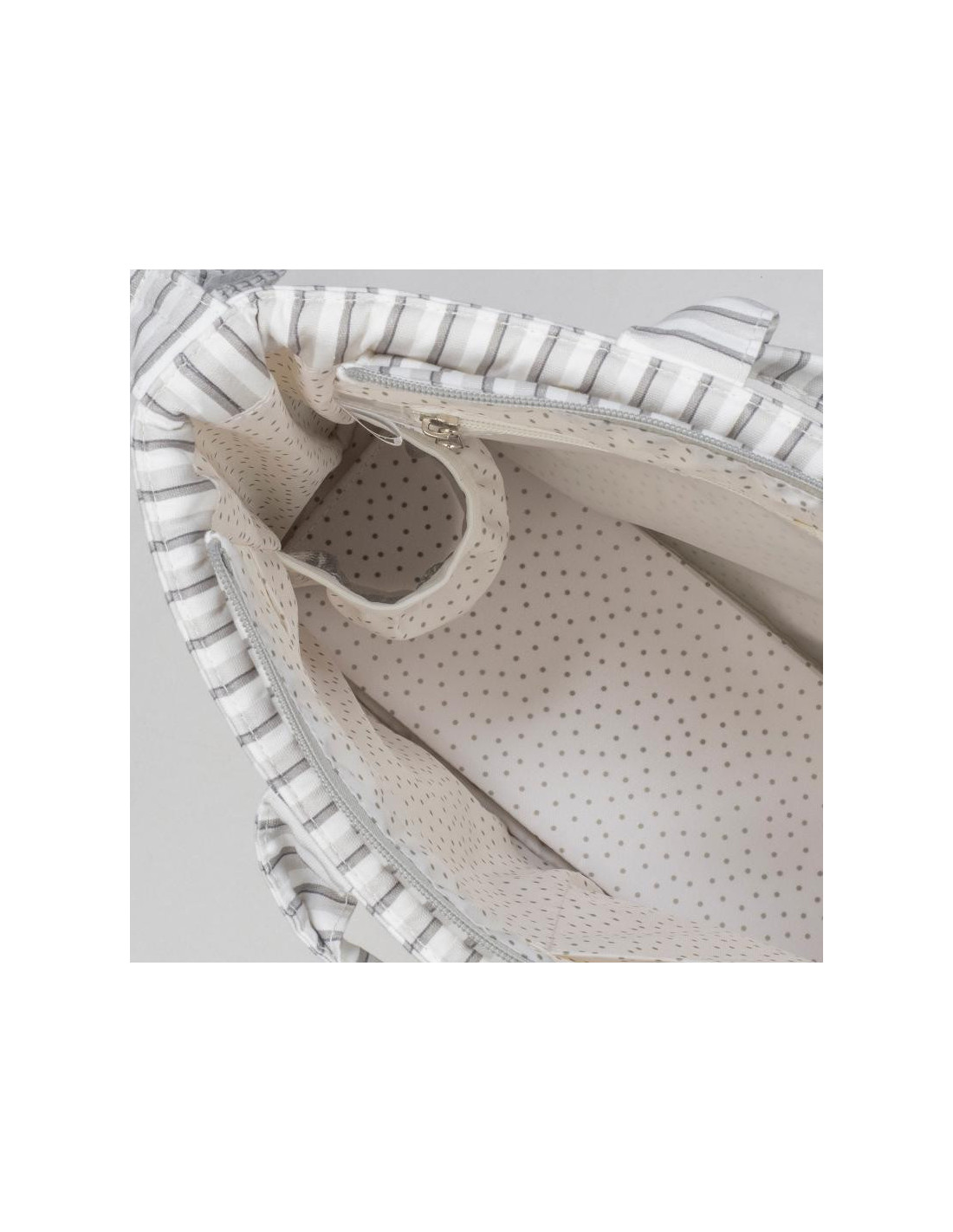 Bolso cambiador Botton con estampado de rayas para silla de paseo que incluye cambiador para bebé. Bolsa canastilla muy ligera, resistente y de gran capacidad para llevar todo lo necesario para el paseo del bebé. Tiene múltiples bolsillos para poder tener todo ordenado. En el interior incorpora un bolsillo plastificado para la ropa húmeda, un bolsillo térmico para biberones y dos bolsillos para lo que necesites tener más a mano. La bolsa tiene un sistema universal de fijación, con 2 asas cortas ajustables que facilita la colocación en cualquier modelo de silla de paseo. También incorpora una asa larga para poder colgarla en el hombro y asas cortas para cogerla con la mano. Gran calidad y mucho estilo. Fabricada en algodón 100% con un tratamiento waterproof, de fácil limpieza a mano o a máquina a 30 °C. Walking Mum protege a tu bebé utilizando los mejores tejidos, libres de colorantes azoicos y sustancias nocivas para la salud. Nuestra colección Walking Mum está diseñada con un particular sello de estilo urbano y moderno que no pasa desapercibido, para vestir diferente los paseos con tu bebé. Las bolsas de maternidad de esta línea son más sport y prácticas, especialmente pensadas en mamás y papás modernos que aprecian los diseños más actuales y en tendencia sin dejar de lado la calidad y la funcionalidad de los accesorios que complementan y hacen más cómodos todos los paseos con sus bebés. Especificaciones: Materiales: 100% algodón con tratamiento waterproof. Medidas: 44 x 29 x 12 cm.