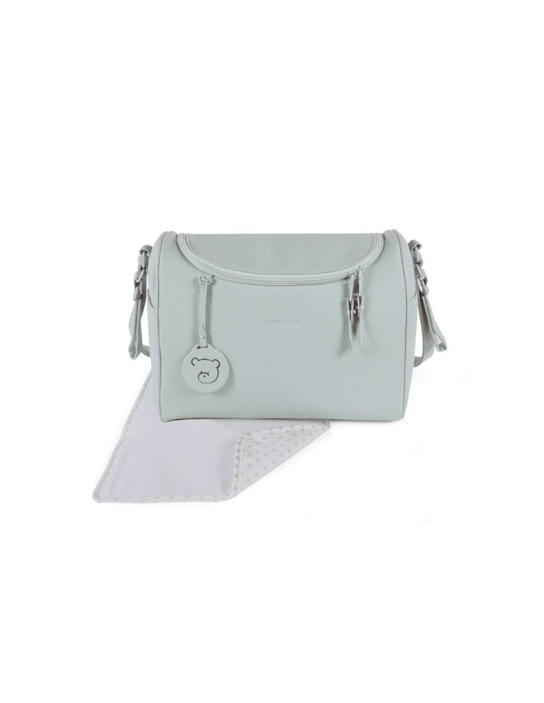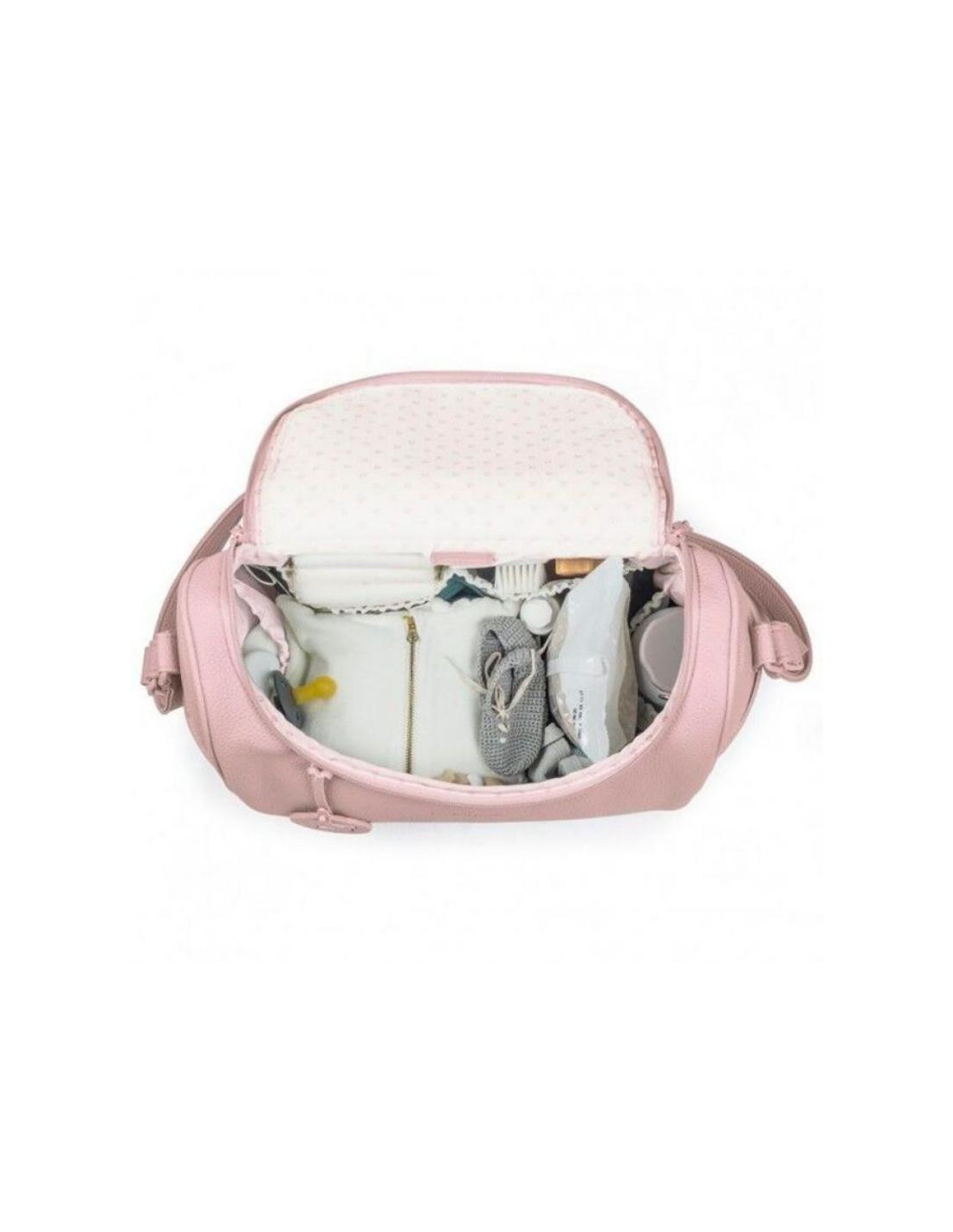 Viene acondicionado con doble asa, una larga para colgar en el hombro y unas cortas para colgar en el cochecito.