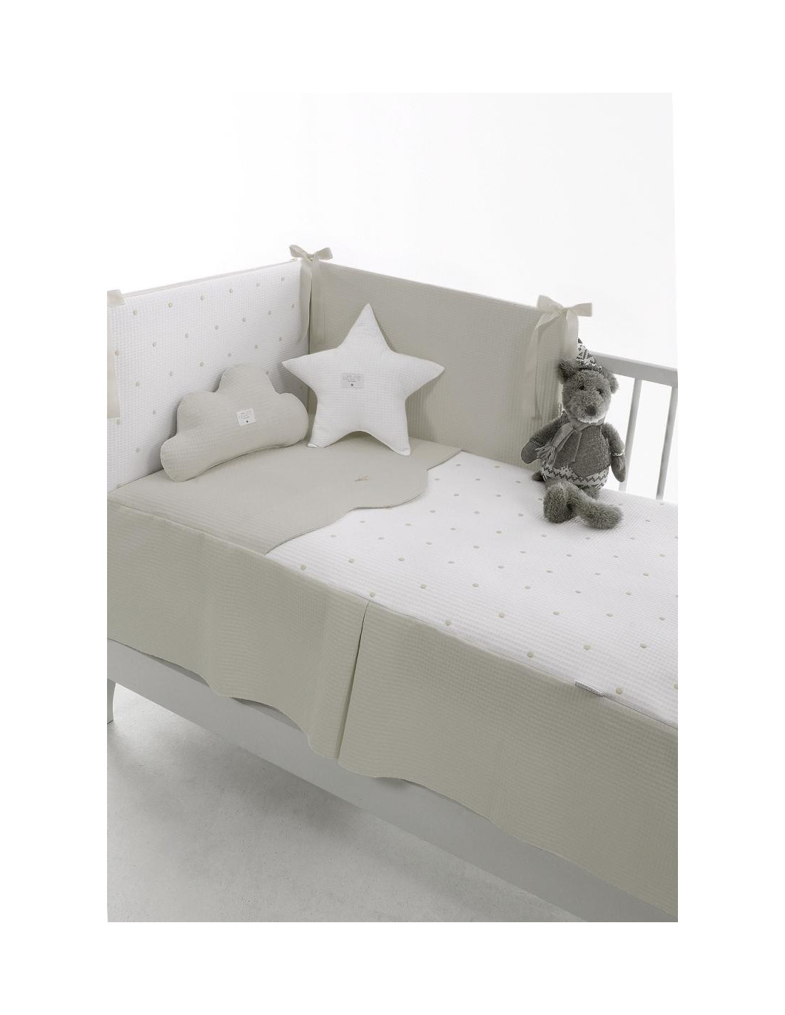 Pack de cuna compuesto por nórdico (funda + relleno) + protector, totalmente desenfundable y reversible, que permite tener vestida tu cuna todo el año por su gran versatilidad. ? Con la encimera nórdica, en invierno el relleno mantiene cálido a tu bebé de manera constante. En verano al extraer el relleno la funda te sirve como colcha liviana. ? Con el protector evitas de las corrientes de aire a tu peque y a su vez lo proteges de posibles golpes con los laterales de la cuna evitando que sus brazos, pies y articulaciones puedan atraparse en la cuna. Esta pieza se ajusta de forma segura y fácil a la estructura de la cuna. Oeko-Tex Standard 100 certificada, lo que significa que todos los materiales son probados y libres de sustancias nocivas Si te gusta puedes encontrar otros interesantes artículos de la colección, en esta misma línea con las mismas altas calidades. Todo realizado y diseñado en España con los mejores materiales y los tejidos de la más alta calidad.