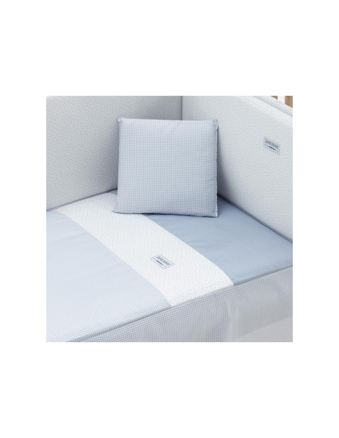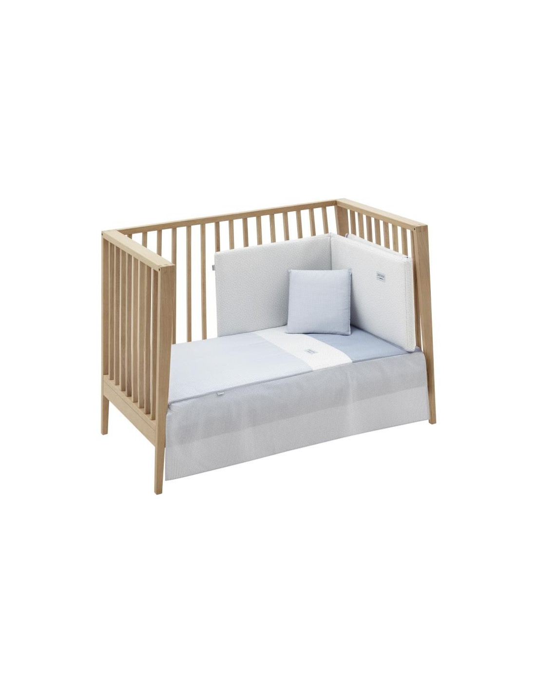 Juego de 2 piezas para vestir la cuna, compuesto por colcha invierno/verano más protector incluye un bonito cojín bordado. La colcha, es la prenda que viste la cuna y cumple el cometido de protección contra el frío como si de una manta o una funda nórdica se tratara. Su cualidad de tener un relleno desenfundable la convierte en una prenda versátil para ser utilizada en invierno y en verano y también ofrece la ventaja de ser lavada con facilidad. Dispone de 3 volantes que cumplen la función de vestir la cuna. El protector fabricado con tejido cuyo interior va acolchado con fibra hueca, amortigua los posibles golpes del bebe contra la cuna.