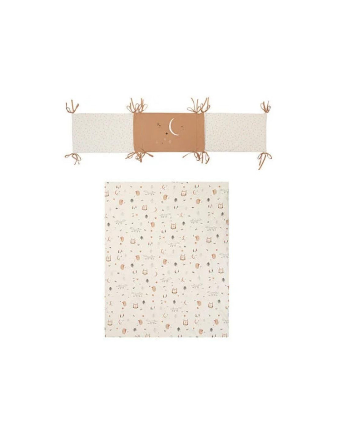 Tejido en algodón orgánico 96%, elastano 4%. Relleno de fibra de poliéster 100%. Incluye las 2 piezas Desenfundable. Para cuna de 60x120cm. Instrucciones de lavado: Lavar a 30C máximo ? Planchar a temperatura media ? No usar lejía ? No lavar en seco.