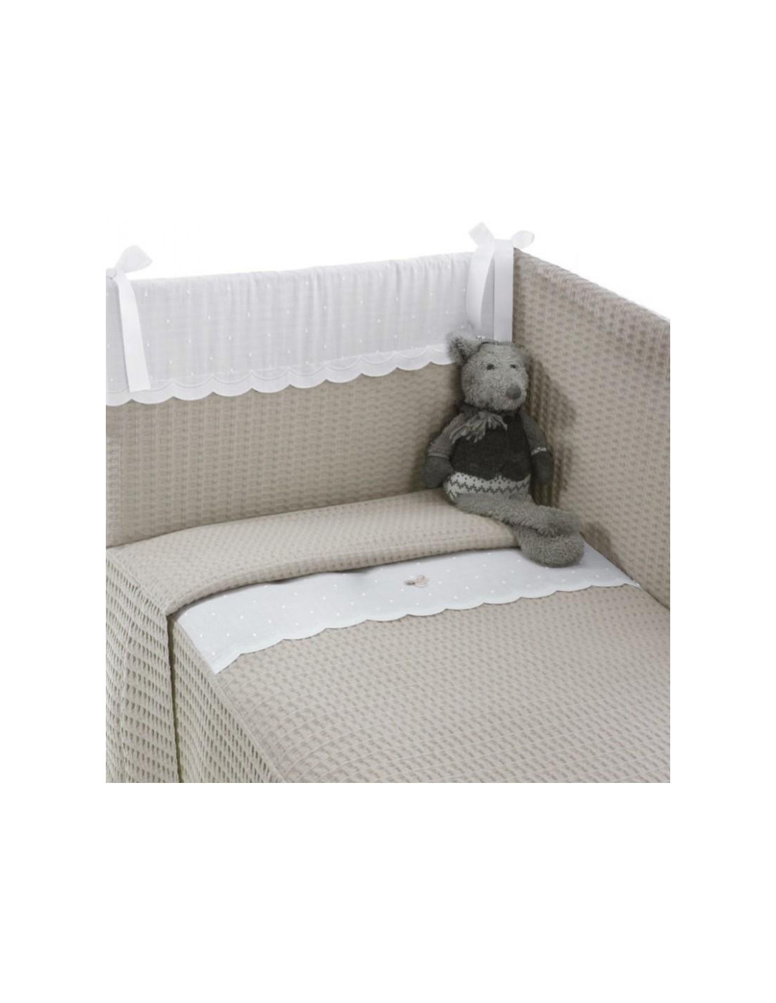 Pack de colcha y protector desenfundable con tejido lavable y relleno incluido. CON Almohada. Con el protector evitaslas corrientes de aire a tu bebe y a su vez lo proteges de posibles golpes con los laterales de la cuna evitando que sus brazos y sus pies puedan atraparse en la cuna. Esta pieza se ajusta de forma segura y fácil a la estructura de la cuna. La colcha tiene un diseño coordinado con el protector. En invierno el relleno mantiene cálido a tu bebé de manera constante. En verano al extraer el relleno la funda te sirve como colcha liviana. Oeko-Tex Standard 100 certificada, lo que significa que todos los materiales son probados y libres de sustancias nocivas Si te gusta puedes encontrar otros interesantes artículos de la colección, en esta misma línea con las mismas altas calidades. Todo realizado y diseñado en España con los mejores materiales y los tejidos de la más alta calidad.