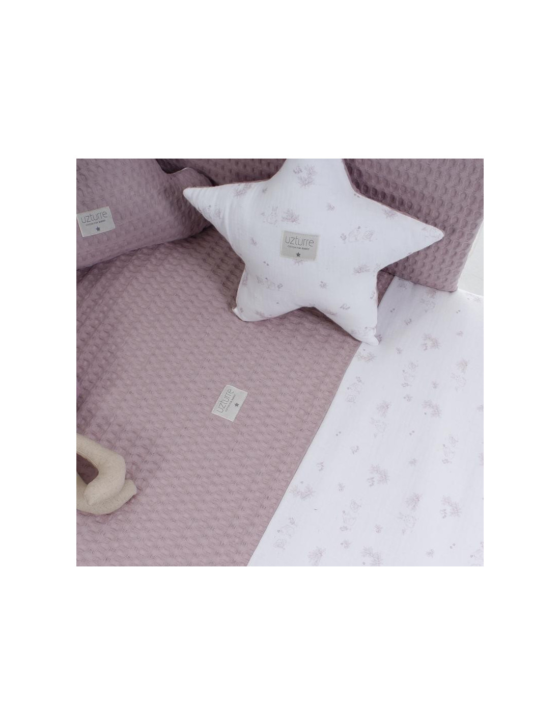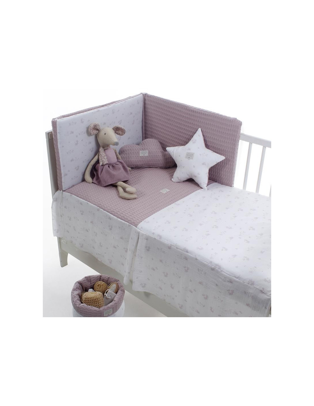Pack de colcha y protector desenfundable con tejido lavable y relleno incluido. SIN Almohada. Con el protector evitas las corrientes de aire a tu bebe y a su vez lo proteges de posibles golpes con los laterales de la cuna evitando que sus brazos y sus pies puedan atraparse en la cuna. Esta pieza se ajusta de forma segura y fácil a la estructura de la cuna. La colcha tiene un diseño coordinado con el protector. En invierno el relleno mantiene cálido a tu bebé de manera constante. En verano al extraer el relleno la funda te sirve como colcha liviana. Oeko-Tex Standard 100 certificada, lo que significa que todos los materiales son probados y libres de sustancias nocivas Si te gusta puedes encontrar otros interesantes artículos de la colección, en esta misma línea con las mismas altas calidades. Todo realizado y diseñado en España con los mejores materiales y los tejidos de la más alta calidad. Los cojines y peluche se venden por separado.