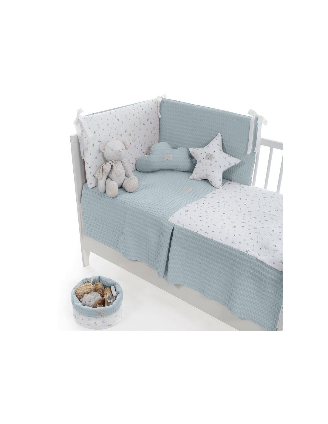 Pack de colcha y protector desenfundable con tejido lavable y relleno incluido. SIN Almohada. Con el protector evitas las corrientes de aire a tu bebe y a su vez lo proteges de posibles golpes con los laterales de la cuna evitando que sus brazos y sus pies puedan atraparse en la cuna. Esta pieza se ajusta de forma segura y fácil a la estructura de la cuna. La colcha tiene un diseño coordinado con el protector. En invierno el relleno mantiene cálido a tu bebé de manera constante. En verano al extraer el relleno la funda te sirve como colcha liviana. Oeko-Tex Standard 100 certificada, lo que significa que todos los materiales son probados y libres de sustancias nocivas Si te gusta puedes encontrar otros interesantes artículos de la colección, en esta misma línea con las mismas altas calidades. Todo realizado y diseñado en España con los mejores materiales y los tejidos de la más alta calidad.