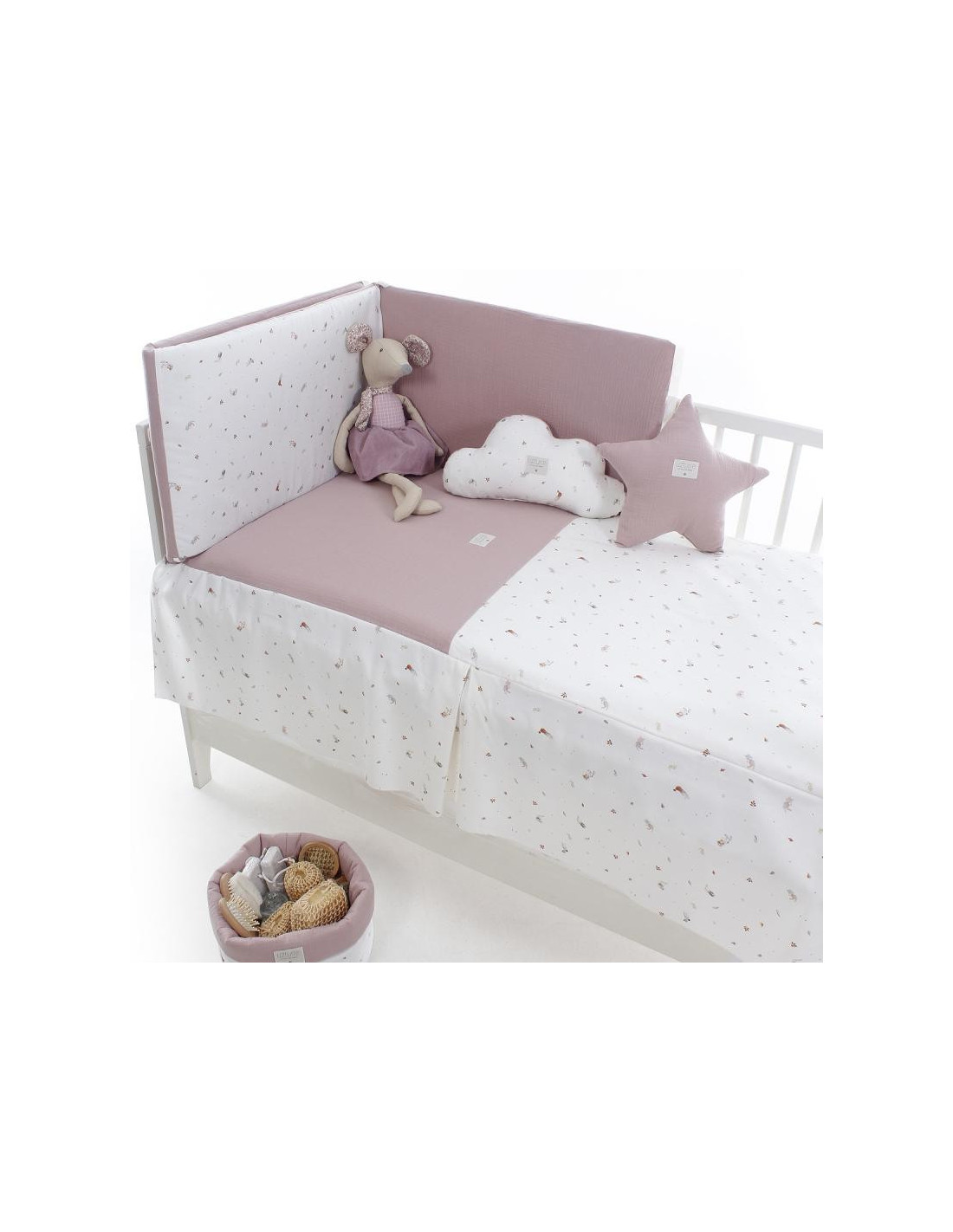Pack de colcha y protector desenfundable con tejido lavable y relleno incluido. SIN Almohada. Con el protector evitas las corrientes de aire a tu bebe y a su vez lo proteges de posibles golpes con los laterales de la cuna evitando que sus brazos y sus pies puedan atraparse en la cuna. Esta pieza se ajusta de forma segura y fácil a la estructura de la cuna. La colcha tiene un diseño coordinado con el protector. En invierno el relleno mantiene cálido a tu bebé de manera constante. En verano al extraer el relleno la funda te sirve como colcha liviana. Oeko-Tex Standard 100 certificada, lo que significa que todos los materiales son probados y libres de sustancias nocivas Si te gusta puedes encontrar otros interesantes artículos de la colección, en esta misma línea con las mismas altas calidades. Todo realizado y diseñado en España con los mejores materiales y los tejidos de la más alta calidad.