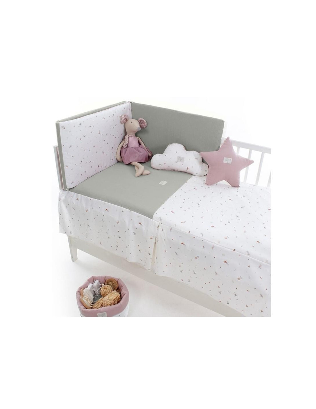 Pack de colcha y protector desenfundable con tejido lavable y relleno incluido. SIN Almohada. Con el protector evitas las corrientes de aire a tu bebe y a su vez lo proteges de posibles golpes con los laterales de la cuna evitando que sus brazos y sus pies puedan atraparse en la cuna. Esta pieza se ajusta de forma segura y fácil a la estructura de la cuna. La colcha tiene un diseño coordinado con el protector. En invierno el relleno mantiene cálido a tu bebé de manera constante. En verano al extraer el relleno la funda te sirve como colcha liviana. Oeko-Tex Standard 100 certificada, lo que significa que todos los materiales son probados y libres de sustancias nocivas Si te gusta puedes encontrar otros interesantes artículos de la colección, en esta misma línea con las mismas altas calidades. Todo realizado y diseñado en España con los mejores materiales y los tejidos de la más alta calidad.