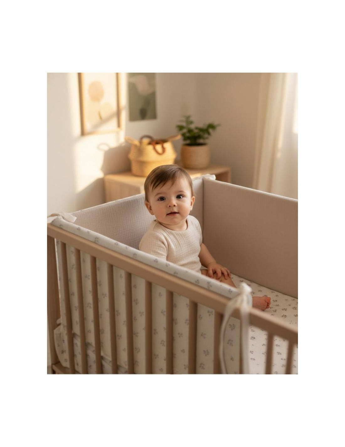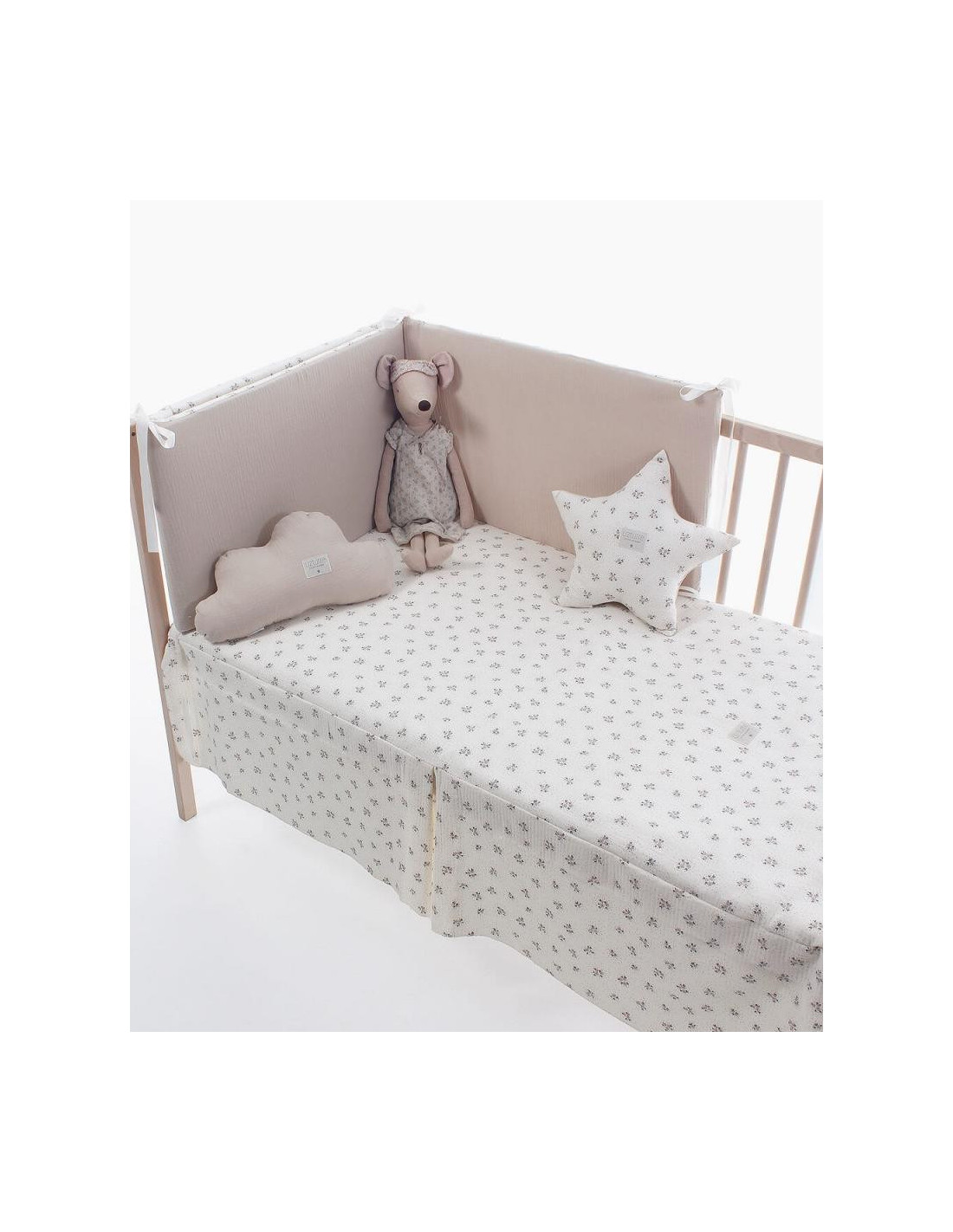 Pack de colcha y protector desenfundable con tejido lavable, relleno incluido y almohada. El protector es doble cara. El protector evita corrientes de aire y protege al bebé de golpes en los laterales de la cuna, impidiendo que manos o pies se introduzcan entre los barrotes. Se ajusta de forma segura y sencilla a la estructura. La colcha, coordinada con el protector, es versátil y práctica: en invierno, el relleno mantiene al bebé cálido